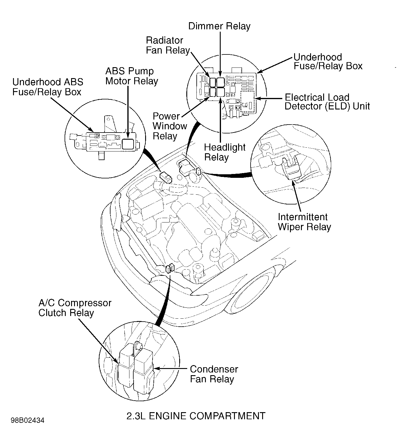 | Underhood ABS Fuse/Relay Box (2.3L) | On right side of engine compartment. See Figure. |