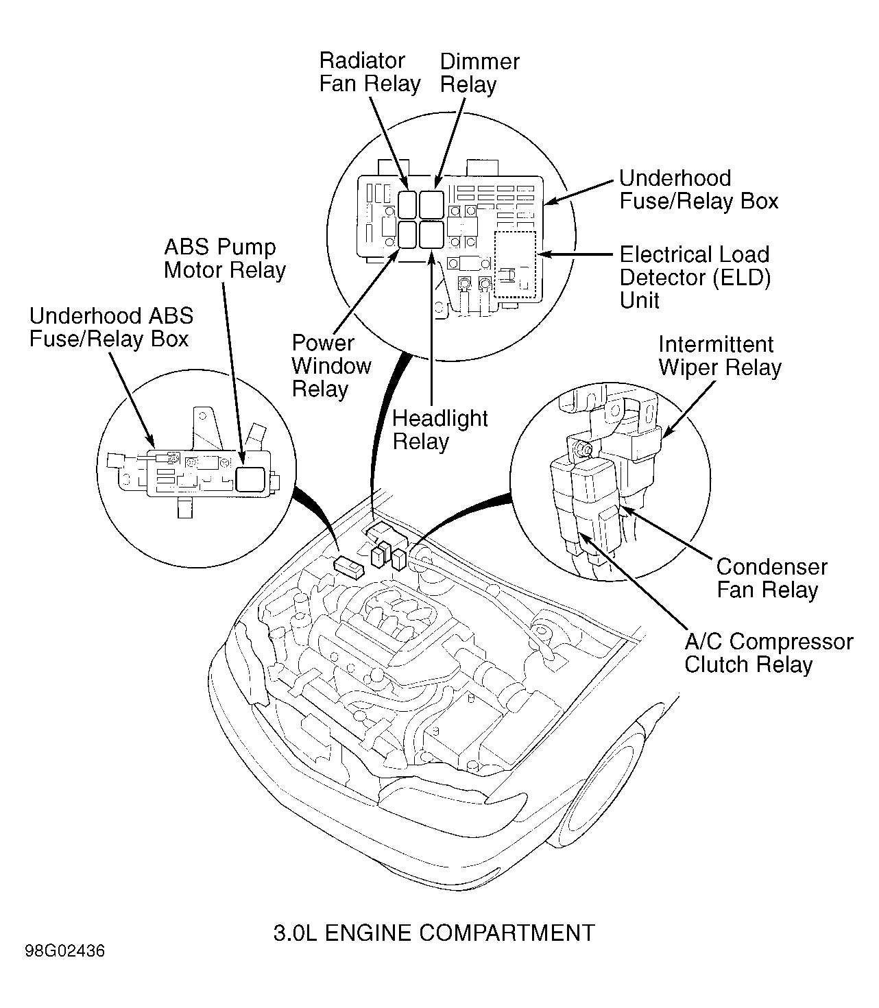 | Underhood ABS Fuse/Relay Box (3.0L) | On right side of engine compartment. See Figure. |