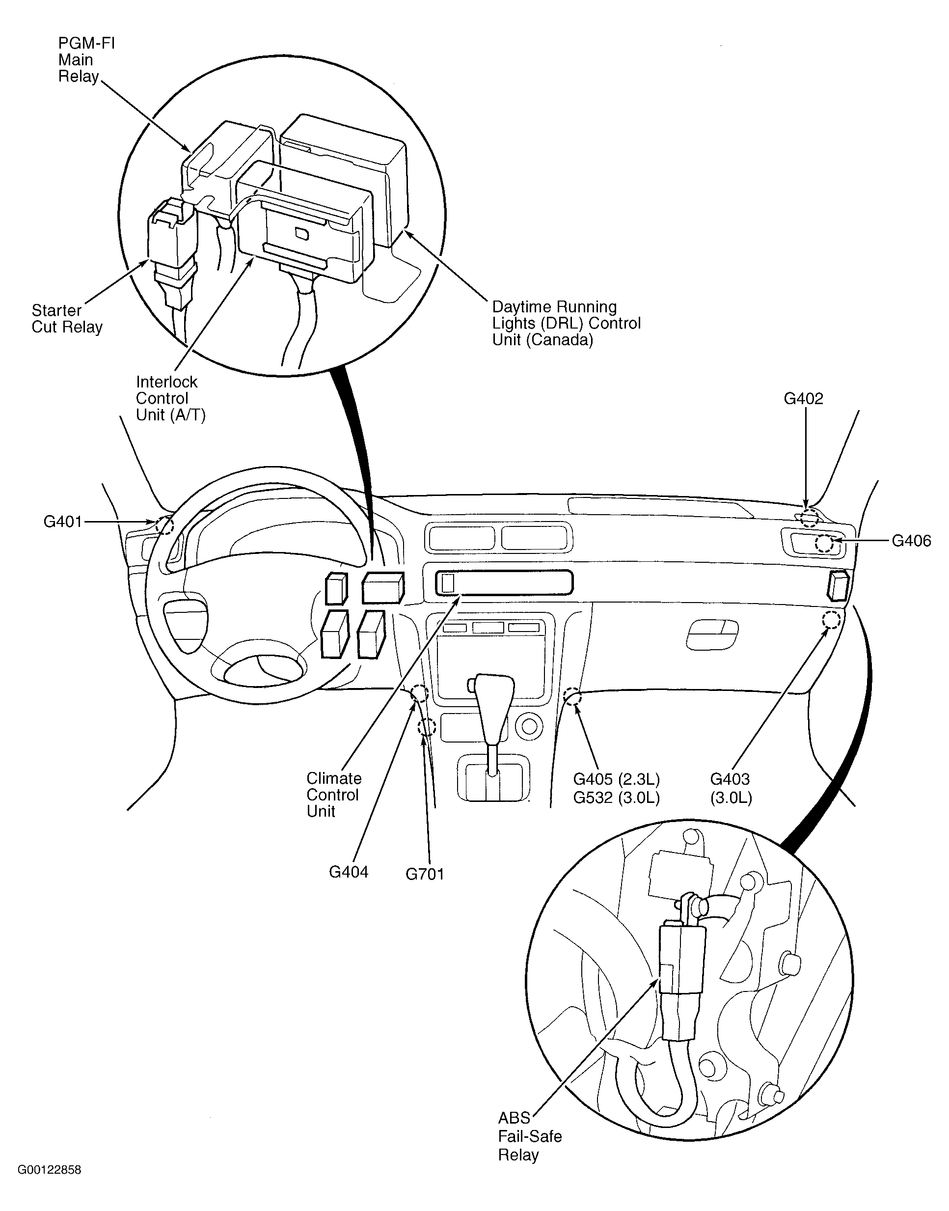 | Daytime Running Lights (DRL) Control Unit (Canada) | Behind left side of dash, right of steering column. See Figure. |
