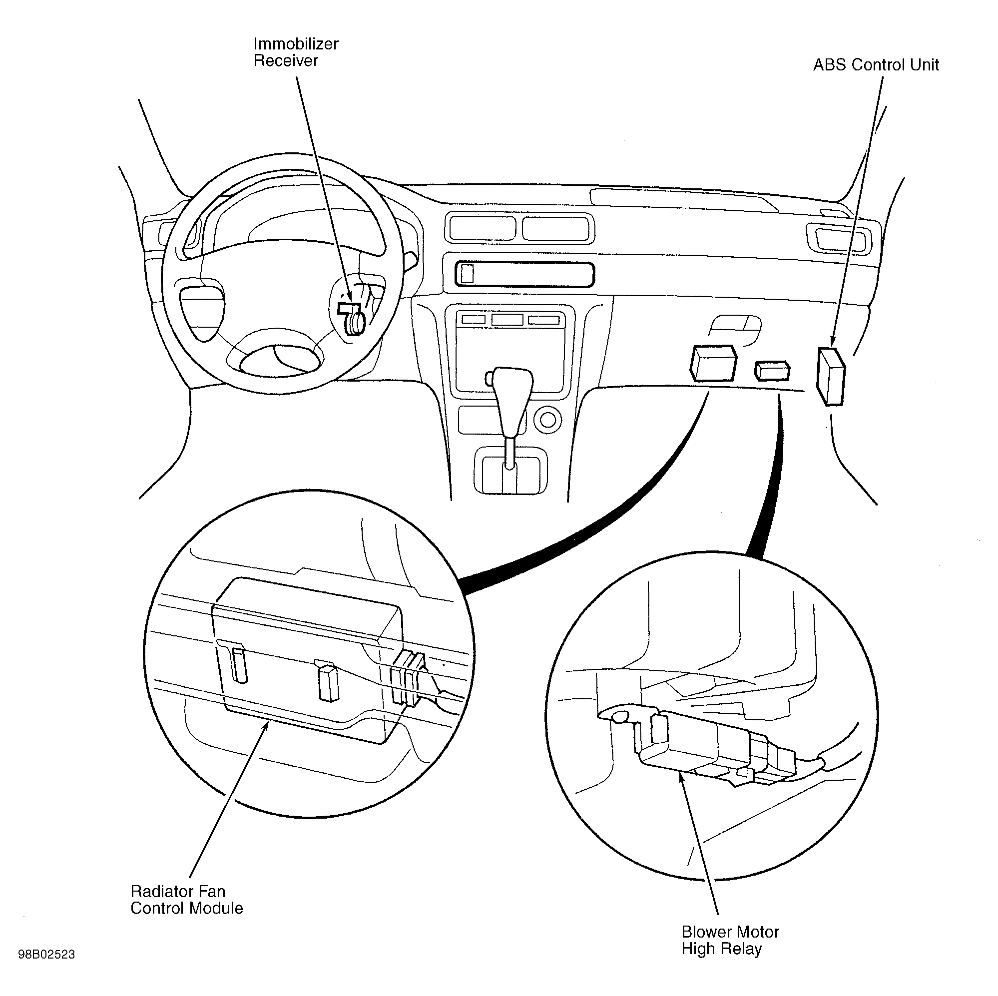 | Interlock Control Unit (A/T) | Behind left side of dash, right of steering column. See Figure. |