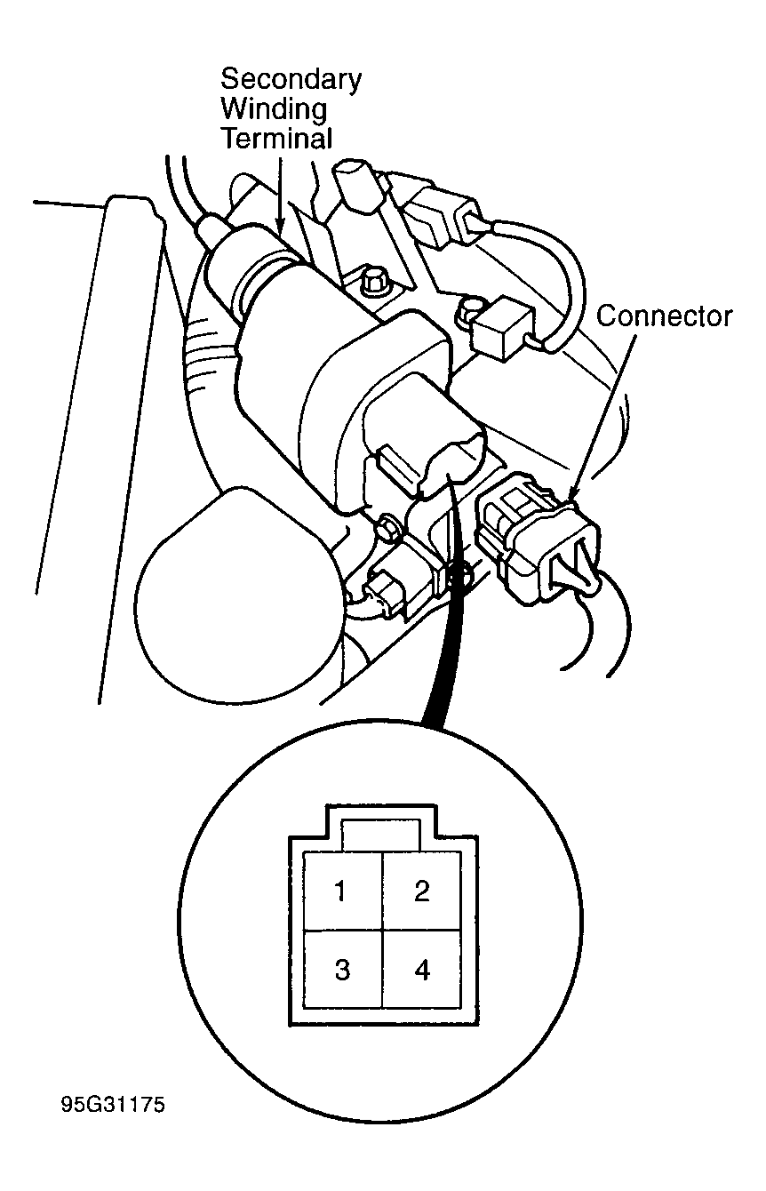 - Measure secondary winding resistance between ignition coil connector middle terminal No. 2 (Black/Yellow wire) and secondary terminal (coil tower). Resistance should be 10,800-16,200 ohms at 68°F (20°C).