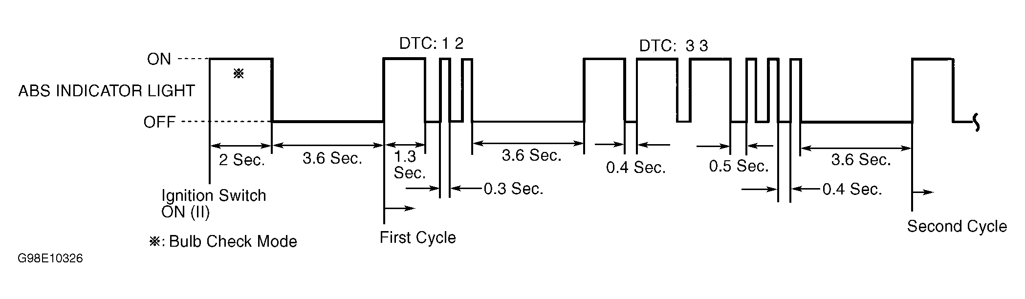 - After ignition is turned on, ABS indicator light will turn on for 2 seconds, then pause for 4 seconds before blinking first DTC. First code number indicates main code and second code number indicates sub code. To recheck sequence, cycle ignition off and then on again. After DTCs have been retrieved, conduct appropriate test procedures. If light does not flash DTC(s), go to ABS INDICATOR LIGHT REMAINS ON, BUT DOES NOT FLASH TROUBLE CODES.