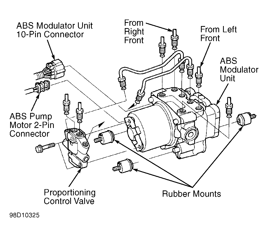 Disconnect 10-pin connector from ABS modulator unit. Disconnect 2-pin connector from ABS pump motor. Remove proportioning control valve. Mark brakelines for reassembly. Disconnect all brakelines. Remove ABS modulator unit from bracket. See Figure .