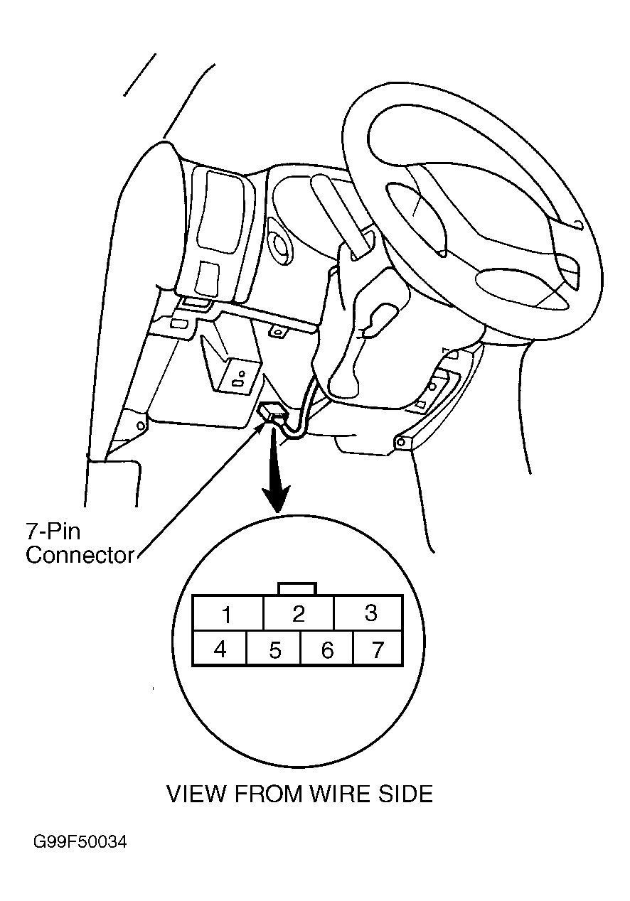 Remove dashboard lower cover and knee bolster. Disconnect main harness 7-pin connector. Using DVOM, check for continuity between main harness 7-pin connector terminals No. 2 and 4. See Fig 1. Continuity should be indicated with key in ignition switch. Continuity should not be indicated with key out of ignition switch. If continuity is not as indicated, replace ignition switch. See IGNITION SWITCH under REMOVAL & INSTALLATION.