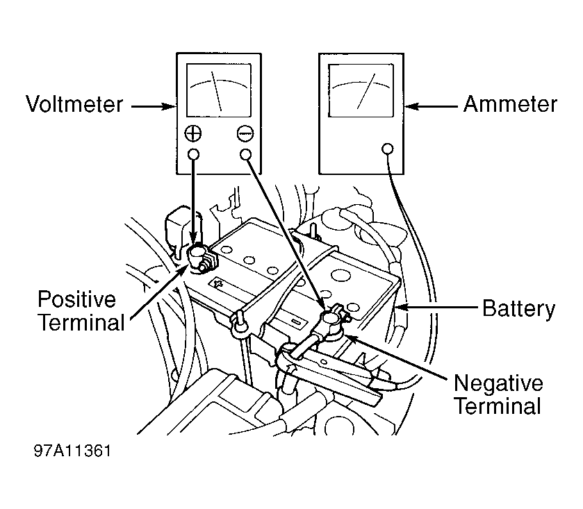 - Connect starter system tester to battery and perform starter cranking test. If starter tester is not available, connect a voltmeter and ammeter to battery. See Fig 1
