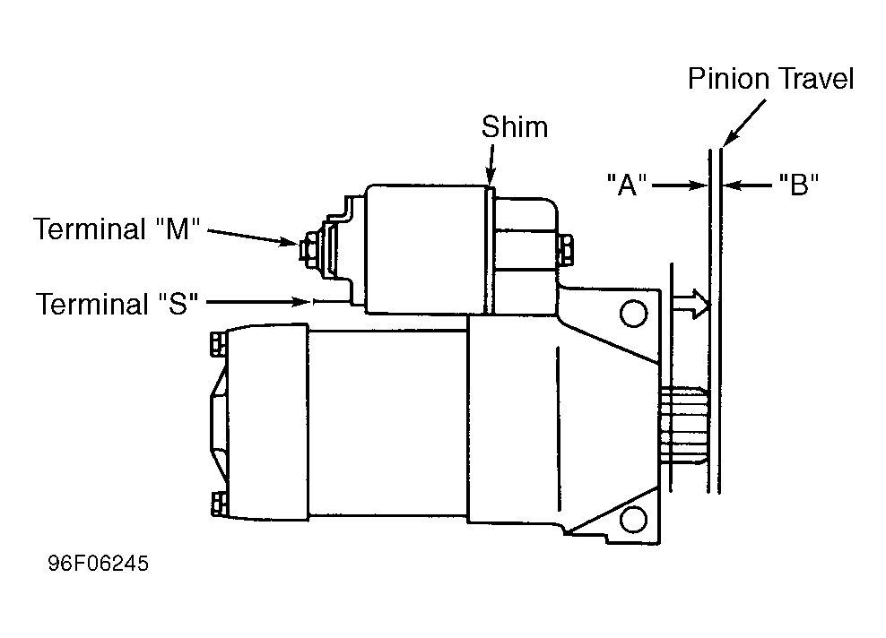 Disconnect terminal "M" wire from starter solenoid. Connect battery voltage to starter solenoid terminal "S". Ground terminal "M". With pinion gear fully extended, pull pinion gear out from starter and measure pinion travel between points "A" and "B". See Fig 1 . If pinion travel is not to specification, add or remove shims between starter solenoid and gear housing cover. See STARTER SPECIFICATIONS .