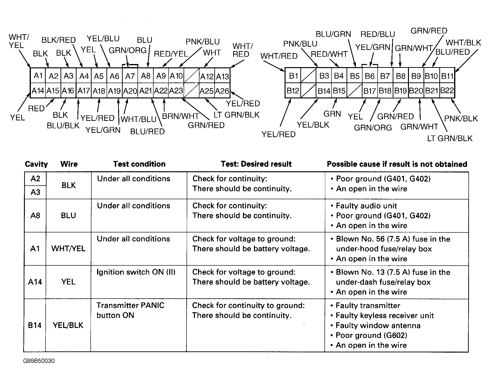 - Remove passenger's multiplex control unit from behind right kick panel. Disconnect control unit connectors. Inspect connectors and terminals. Check for bent, loose or corroded terminals. Perform passenger's multiplex control unit input tests. See Fig 3