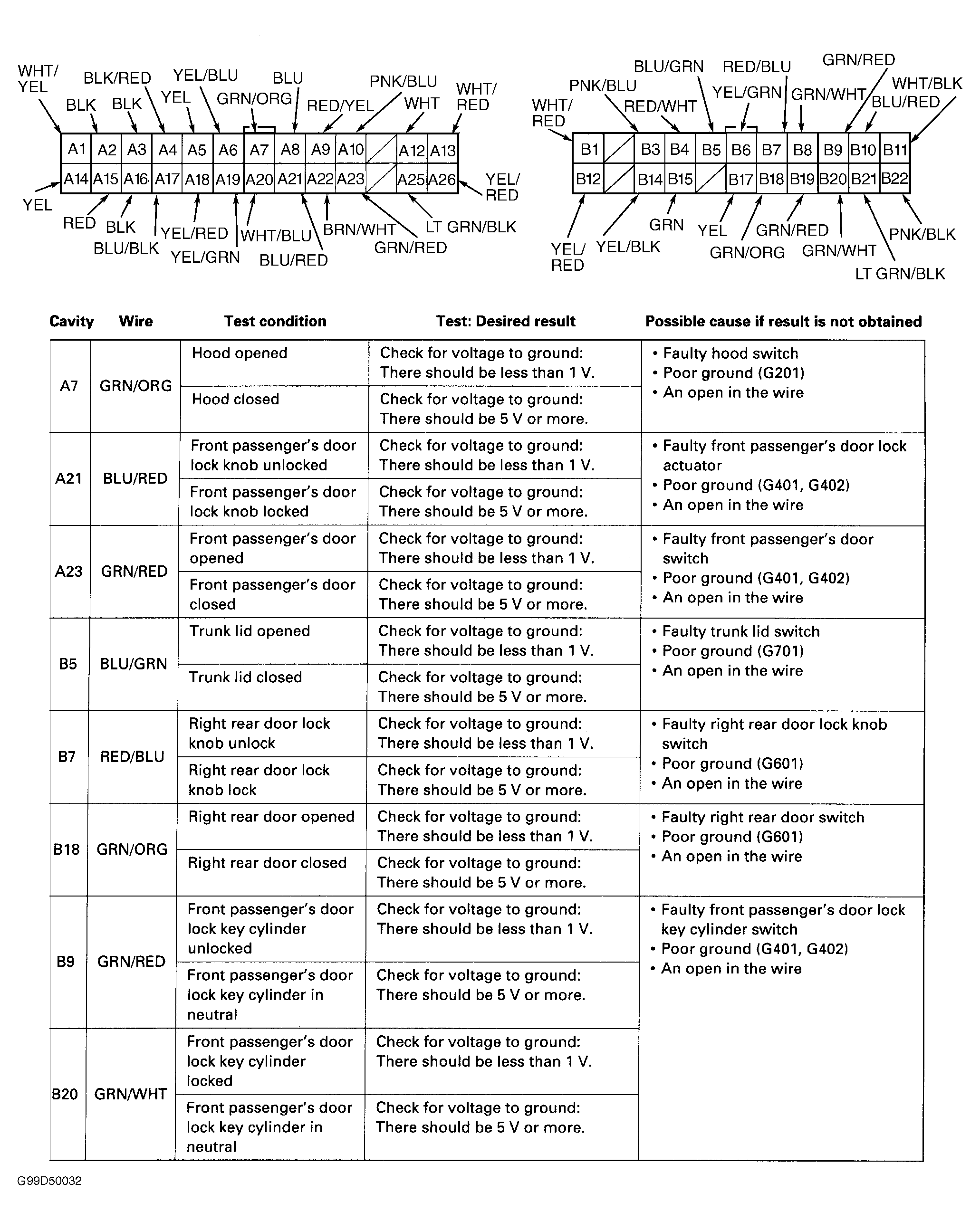 - Reconnect driver's door multiplex control unit connector. Perform second part of driver's door multiplex control unit input test at back of driver's door multiplex control unit connector (backprobe). See Fig 5