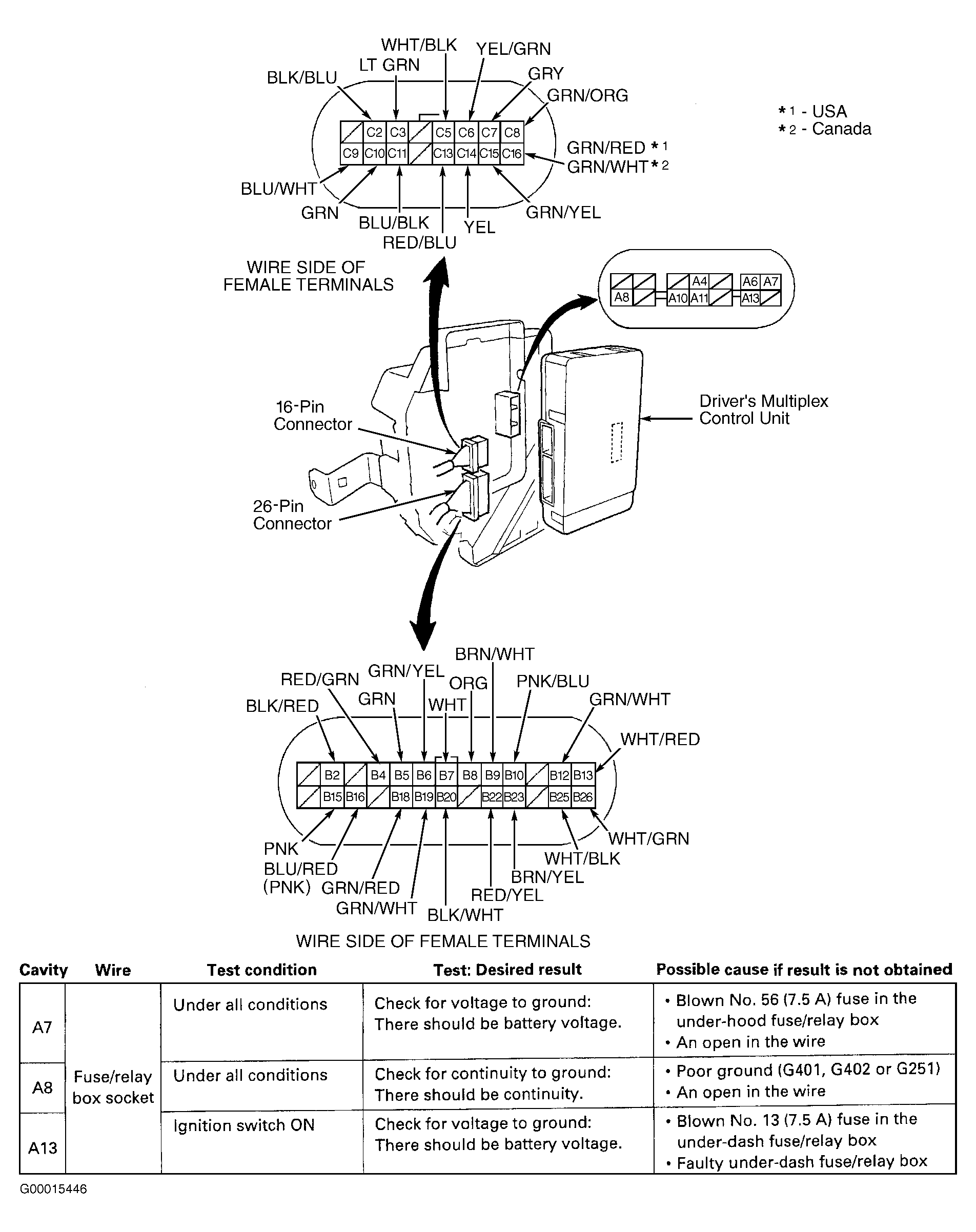 - Check continuity in Pink/Black wire between Green 2-pin service connector terminal No. 2, driver's multiplex control unit 14-pin connector "A" terminal No. 10 and passenger's multiplex control unit 22-pin connector "B" terminal No. 22. See WIRING DIAGRAMS . See Figure , Figure and Figure .