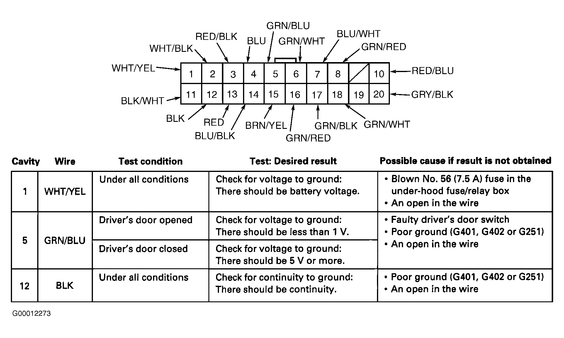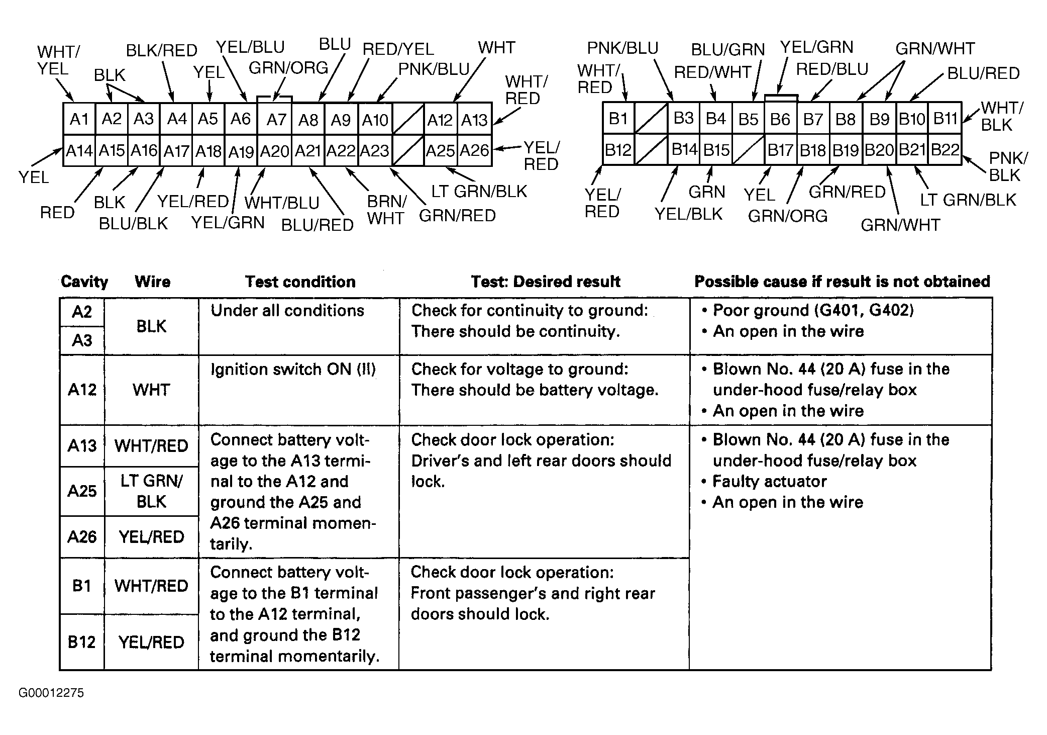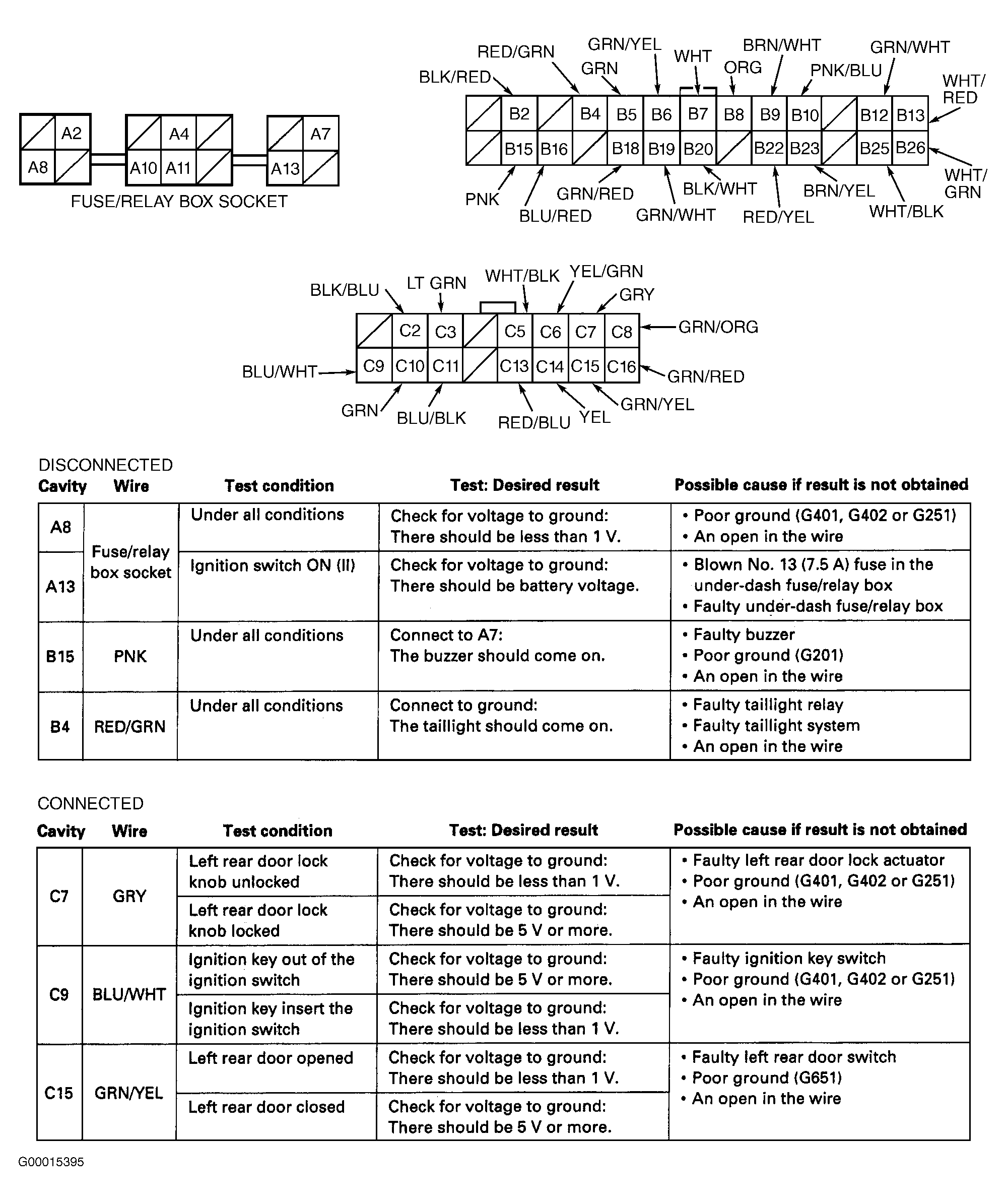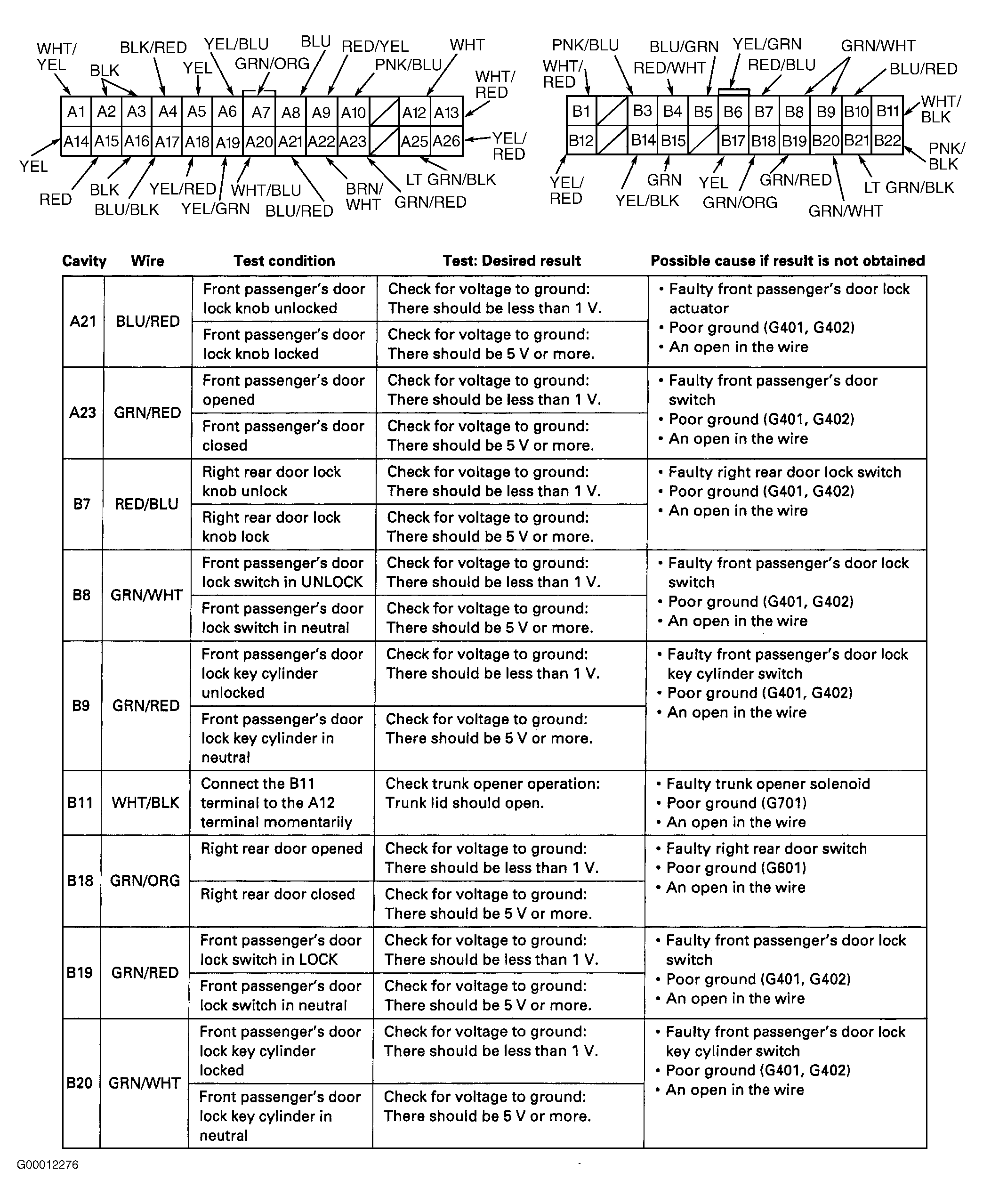 - Reconnect driver's door multiplex control unit connector. Perform tests at back of driver's door multiplex control unit connector (backprobe). See Fig 2