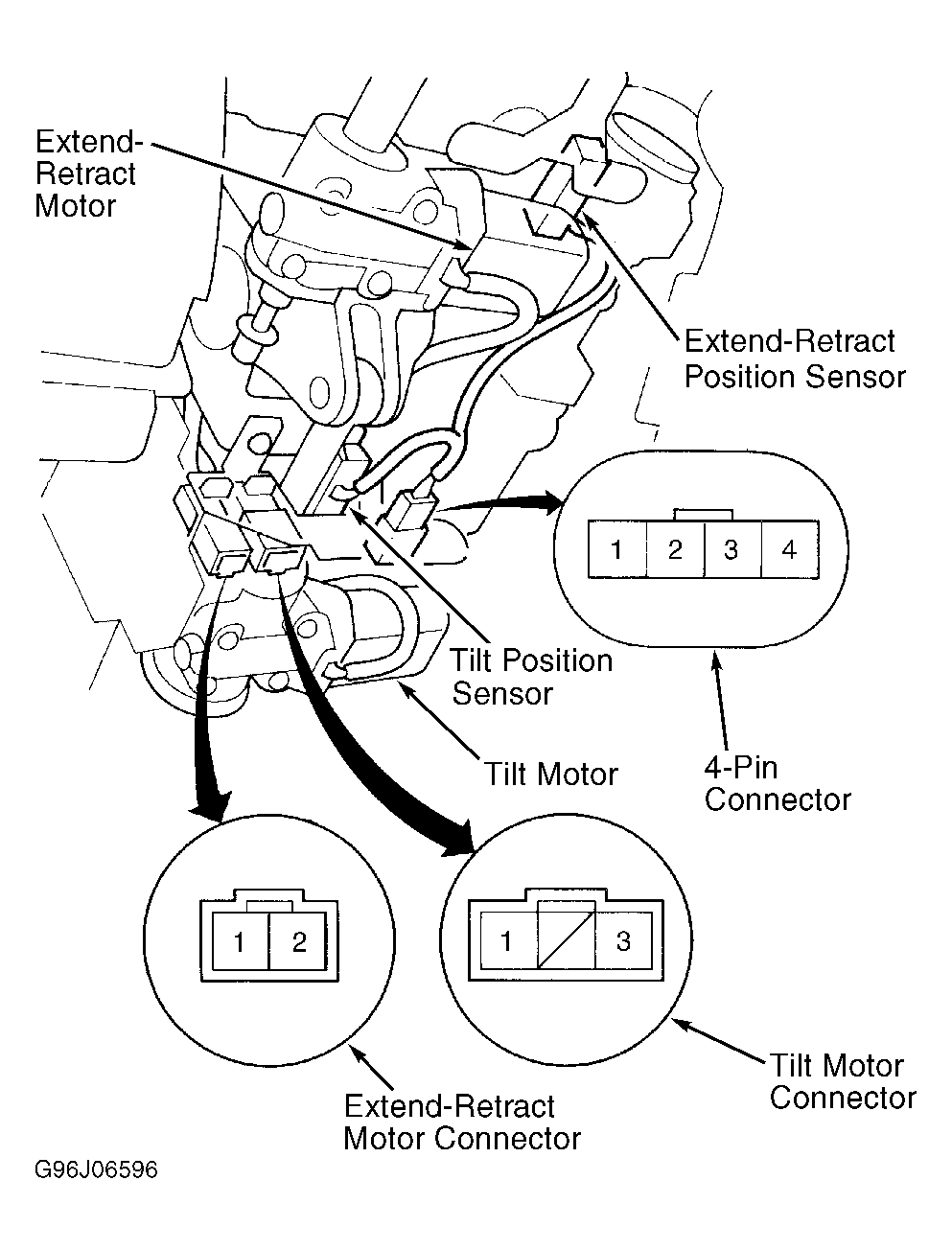 Remove steering column covers. See STEERING COLUMN COVERS under REMOVAL & INSTALLATION. Disconnect tilt/extend-retract position sensor 4-pin connector. See Figure . Using an ohmmeter, verify resistance between terminals is as specified in TILT/EXTEND-RETRACT POSITION SENSOR table. If sensor fails any test, replace faulty sensor.