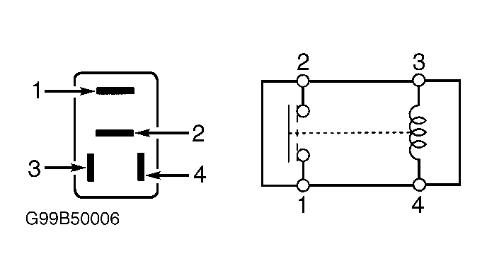 Remove reverse relay from driver's underdash fuse/relay box. Check for continuity between terminals No. 1 and 2. Continuity should not exist. Using fused jumper wires, connect terminal No. 3 to battery voltage and terminal No. 4 to ground. See Fig 1. If continuity does not exist between terminals No. 1 and 2, replace relay.