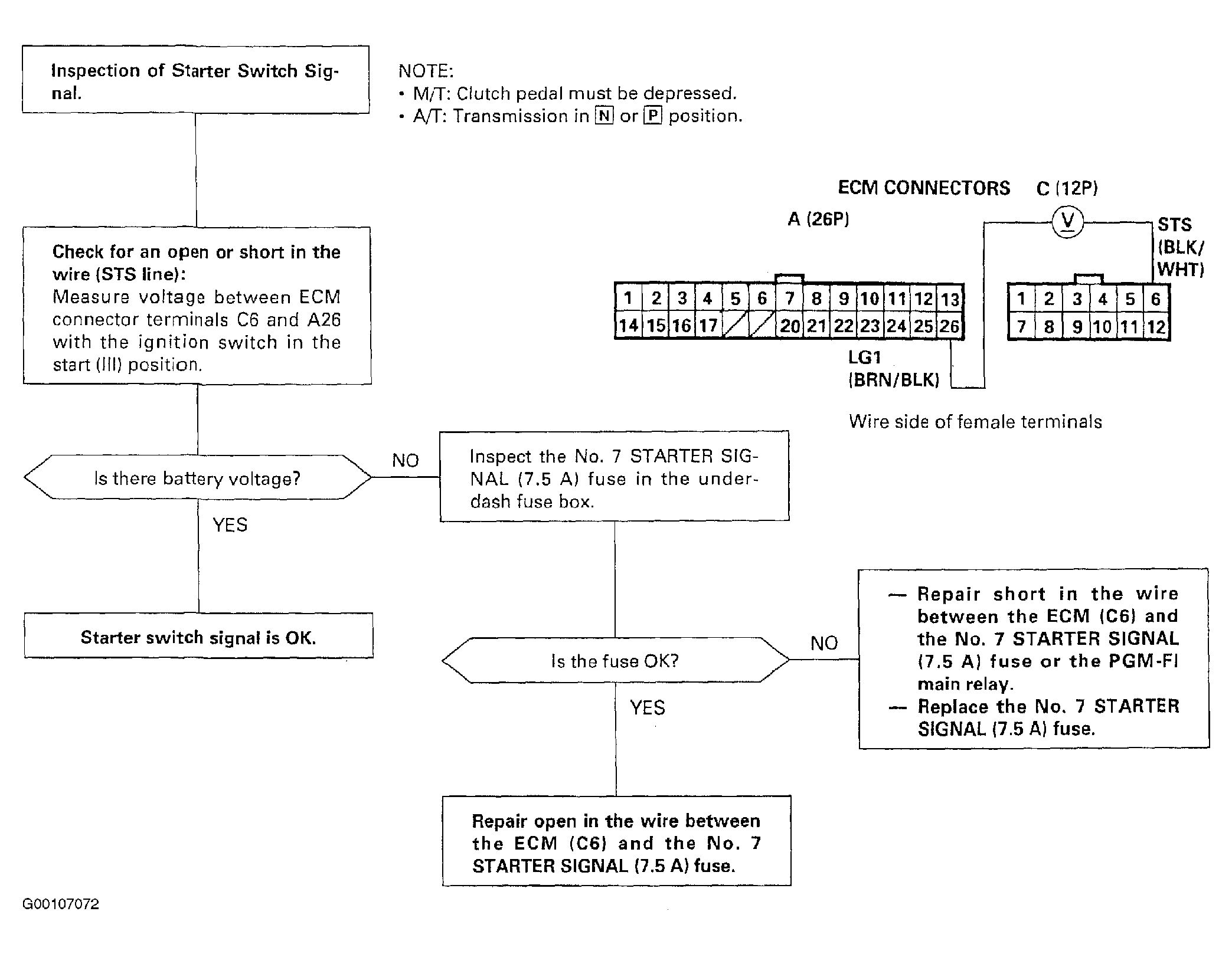 This signals the ECM when the engine is cranking. For troubleshooting of the starter switch signal circuit, see Fig 1 .