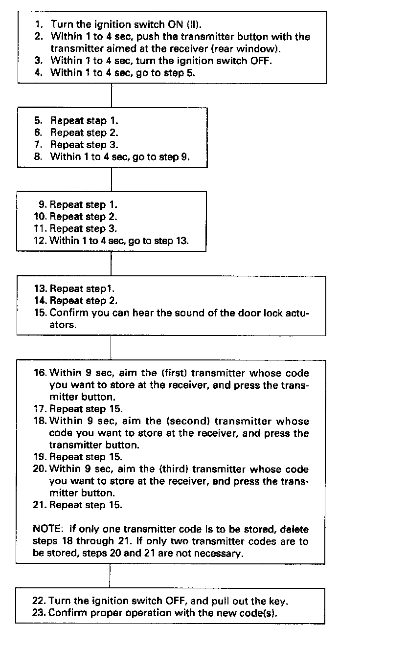 Storing transmitter codes:The codes of up to three transmitters can be read into the keyless receiver unit memory.
