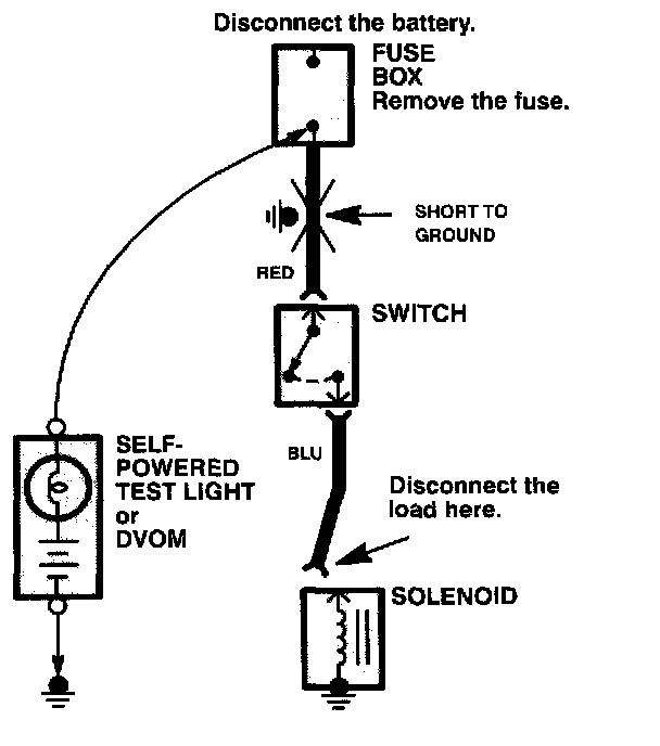 5. If the self-powered test light goes on or the DVOM displays a low reading or no reading (zero), there is a short to ground in the wiring near that point.