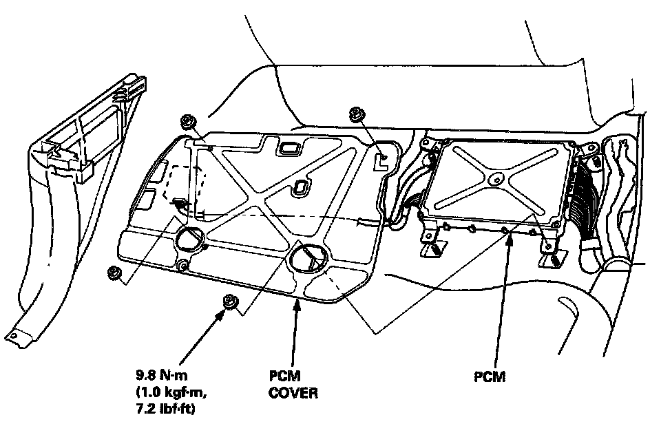 If the inspection for a particular code requires voltage or resistance checks at the PCM connectors, remove the right door sill molding. Pull the carpet back to expose the PCM. Unbolt the PCM cover, and connect the backprobe sets and a digital multimeter as described below. Check the system according to the procedure described for the appropriate code(s) listed.