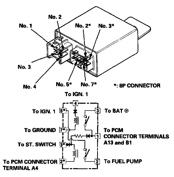 3. Attach the battery positive terminal to the No. 4 terminal and the battery negative terminal to the No. 7* terminal of the PGM-FI main relay. Then check that there is continuity between the No. 3 terminal and No. 1 terminal of the PGM-FI main relay.