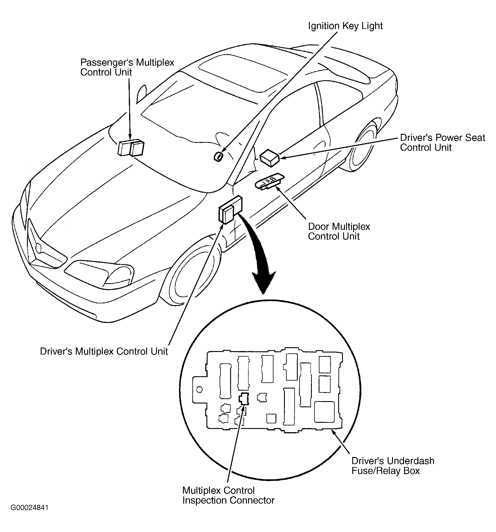 Driver's multiplex control unit is located behind driver's side kick panel. Passenger's multiplex control unit is located behind passenger's side kick panel. Door multiplex control unit is located in driver's door and is incorporated in power window master switch.