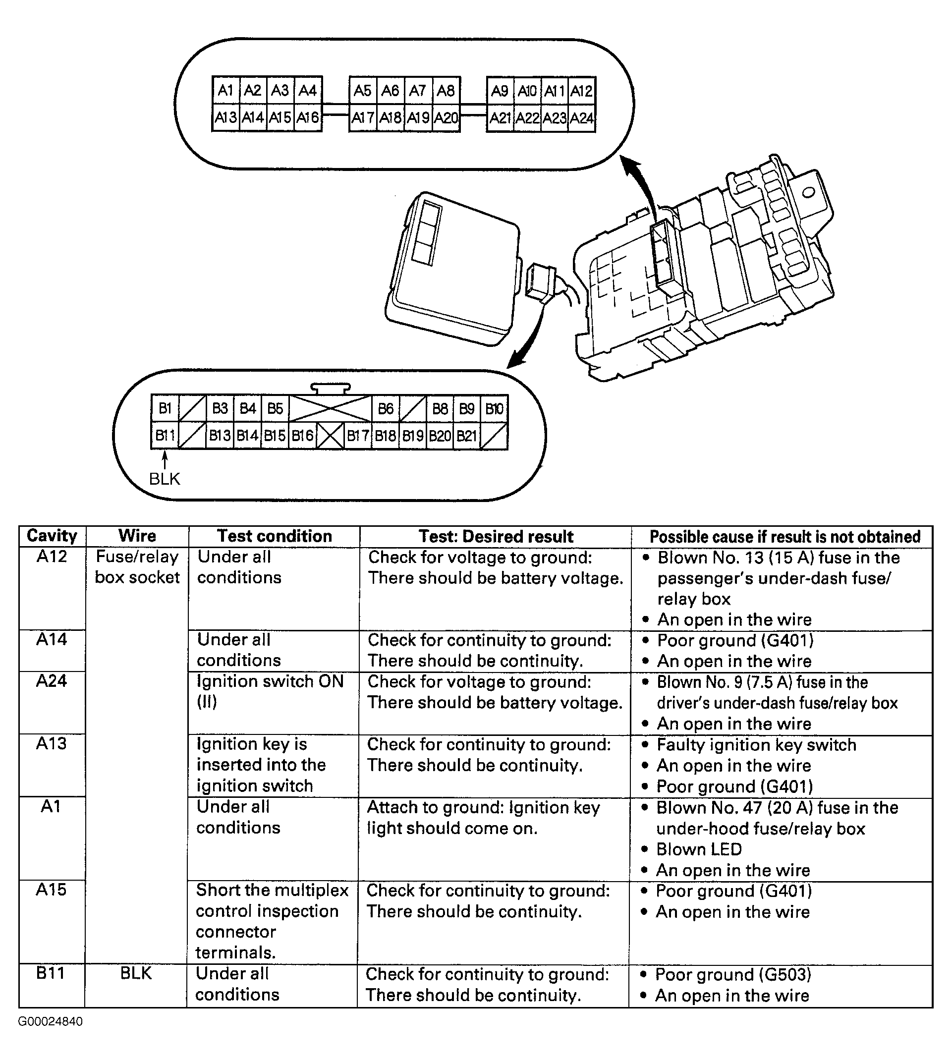 - Check continuity in Brown wire between terminal A15 of door multiplex control unit 20-pin harness connector and terminal A2 of driver's multiplex control unit 24-pin harness connector on driver's underdash fuse/relay box. See Figure and Figure . If continuity exists, go to next step. If continuity does not exist, repair open in Brown wire. After repairs, recheck DTCs.