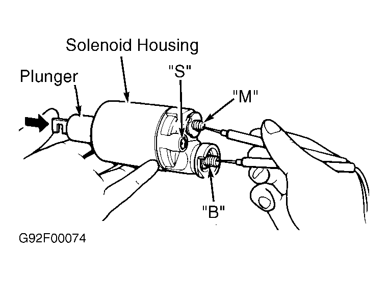 Remove starter solenoid from starter. With starter solenoid plunger in released position, continuity should exist between terminals "M" and "S" and solenoid housing (ground). See Fig 1 . With starter solenoid plunger pushed in, continuity should exist between terminals "B", "M" and "S" and solenoid housing. If continuity is not as specified, replace solenoid.