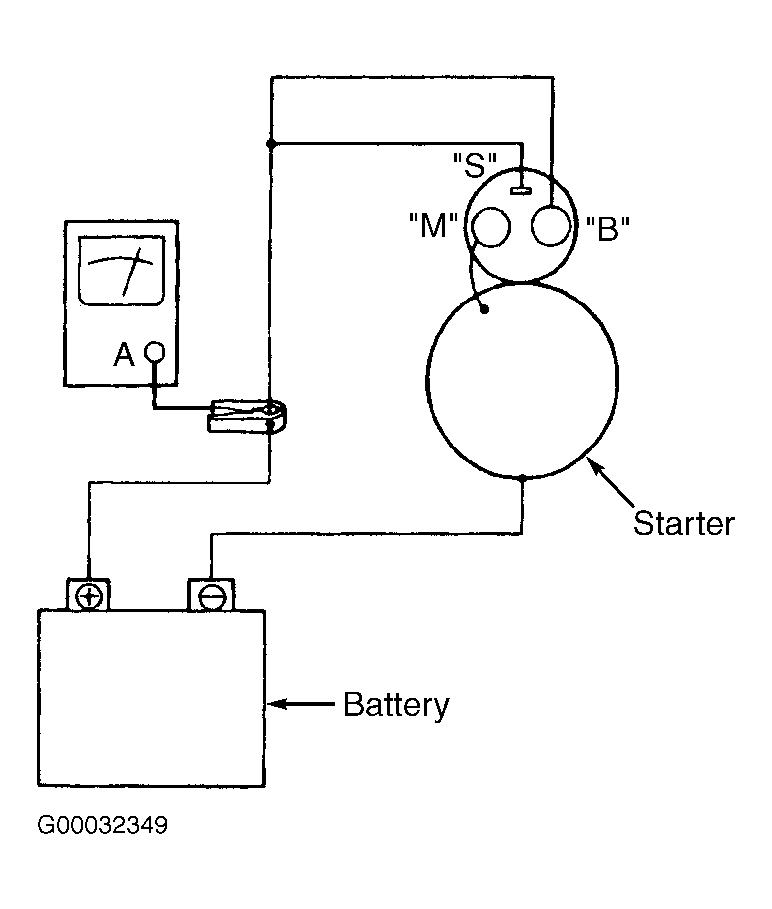 2. Reconnect wire to starter solenoid "M" terminal. Connect starter and ammeter to battery as specified. See Fig 1 . Connect one jumper wire between negative battery terminal and starter housing and a second jumper wire between positive battery terminal and starter terminal "B". Connect a third jumper wire between positive battery terminal and starter terminal "S". Connect ammeter inductive pickup to second and third jumper wire with current flow arrow pointing toward starter. Check starter voltage and amperage, and starter RPM. See NO-LOAD SPECIFICATIONS  table. If no-load test is not to specification, repair or replace starter as needed.