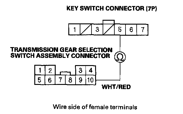 8. Check for continuity between the No. 10 terminal of the transmission gear selection switch assembly connector and the No. 5 terminal of the key switch connector.