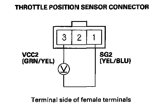 11. Measure the voltage between the No. 1 and No. 3 terminal of the throttle position sensor connector.