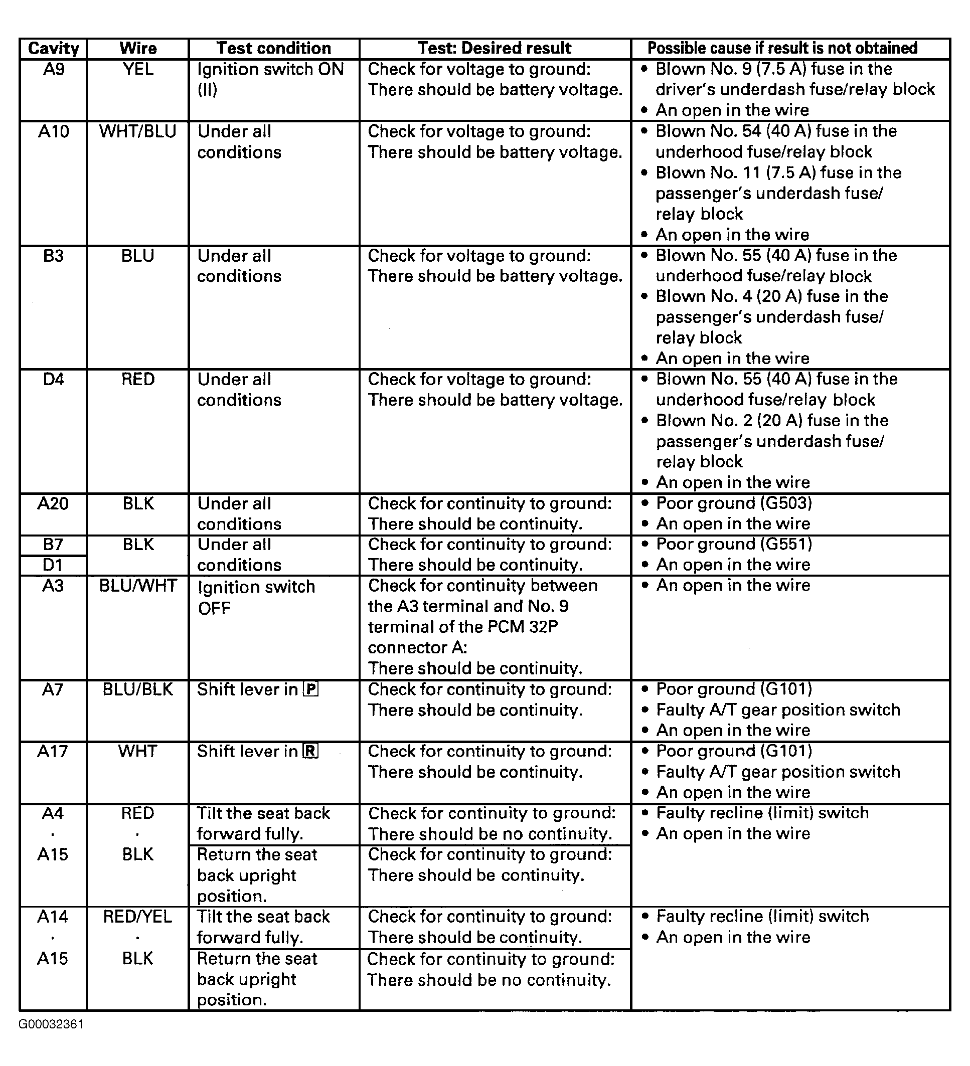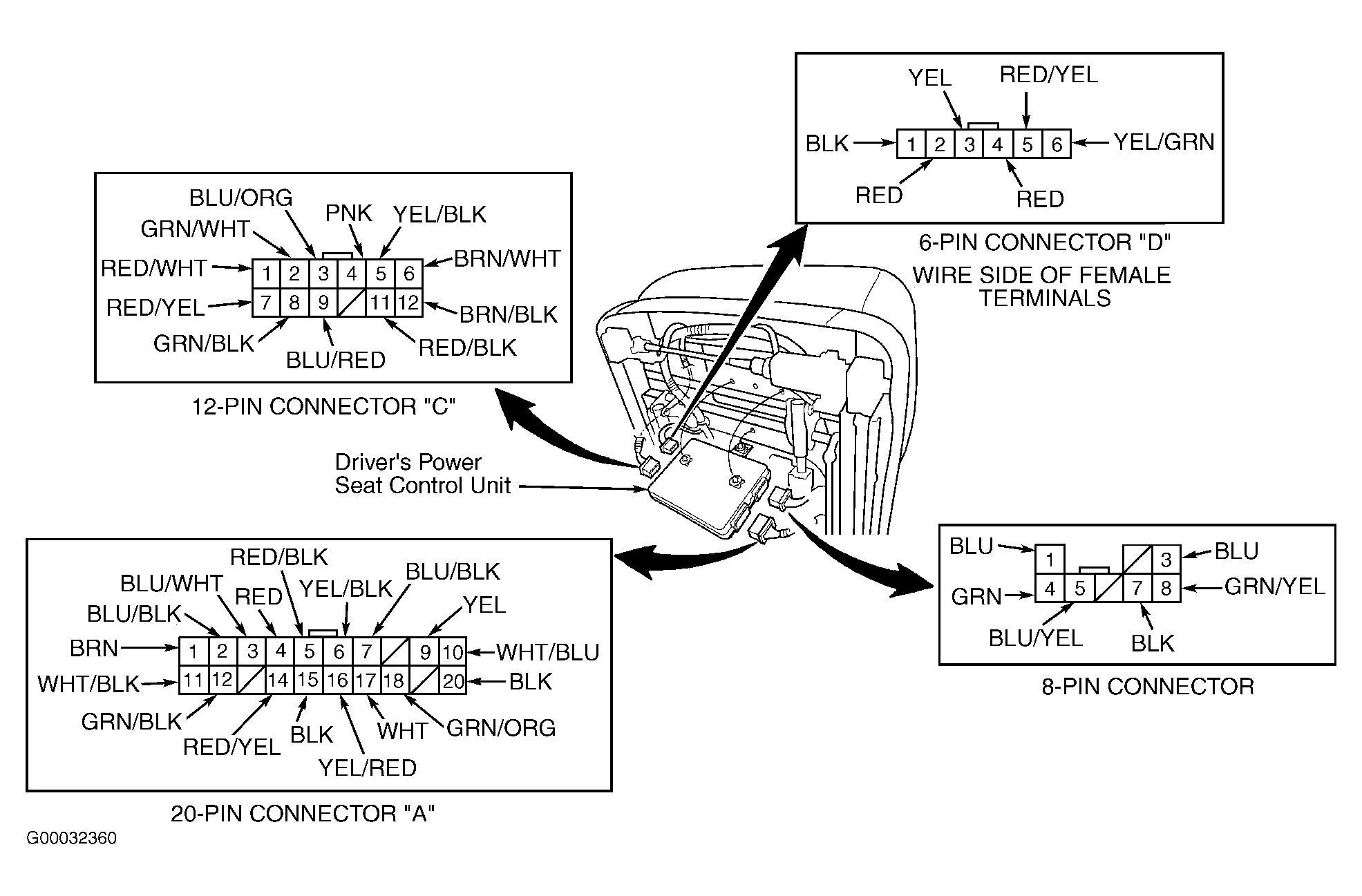 - Reconnect power seat control unit connectors. Perform power seat control unit input test at back of power seat control unit connectors (backprobe). See Fig 1