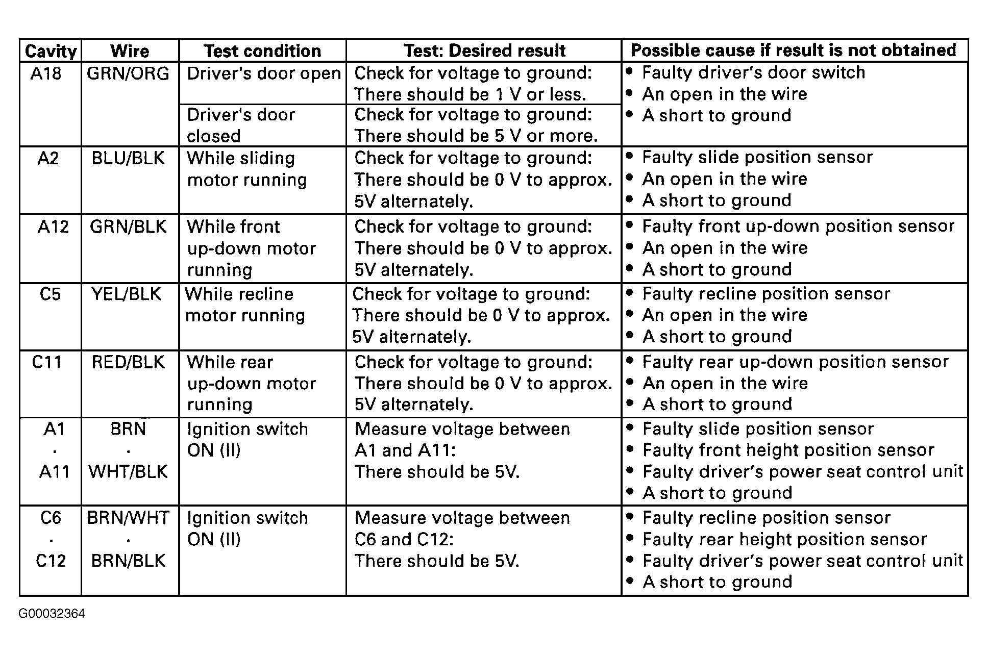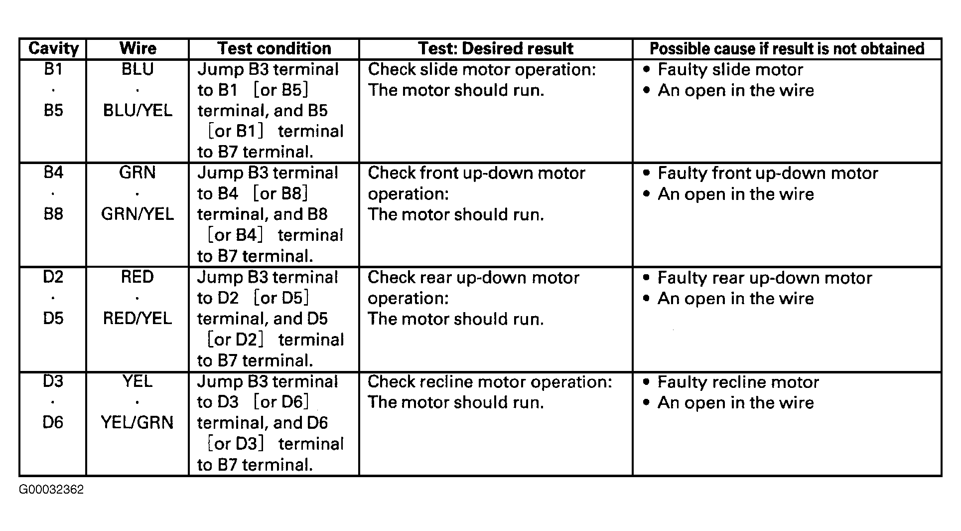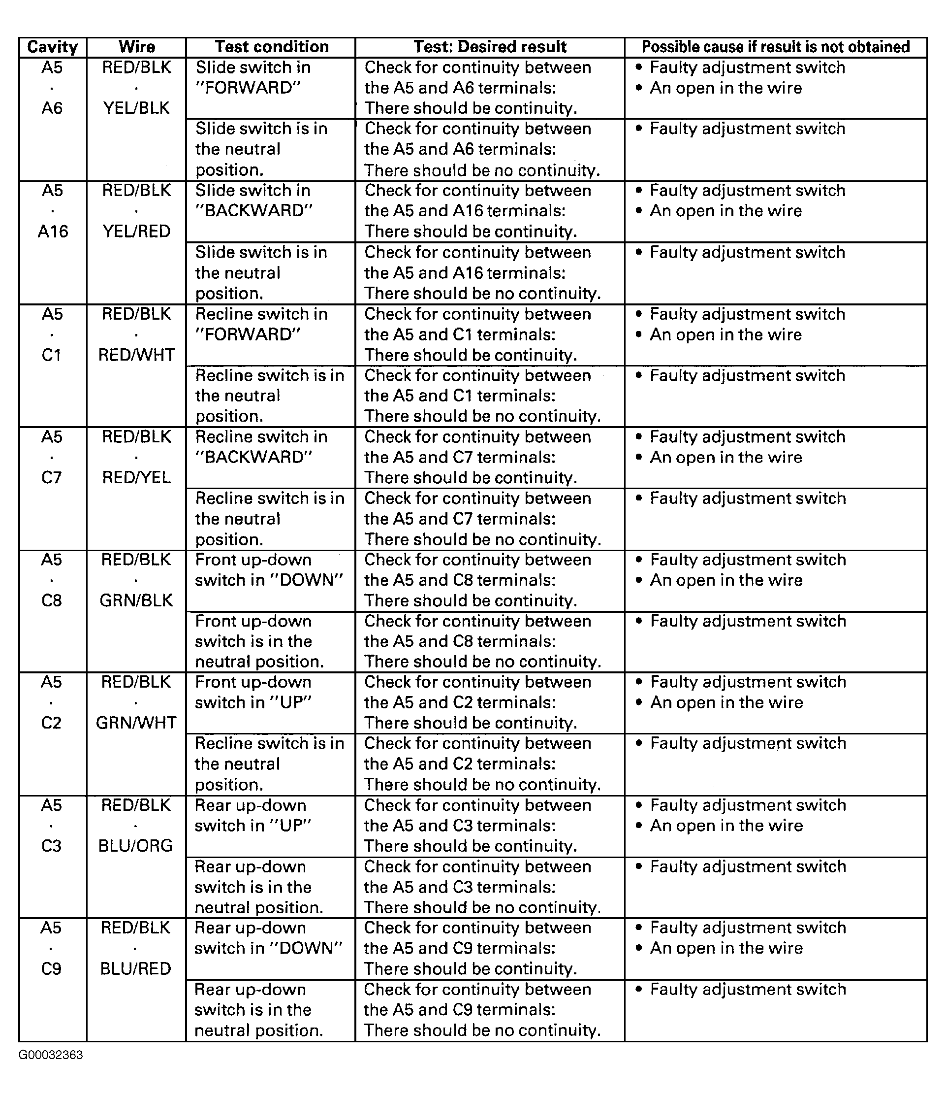 . Repair as necessary. If all tests are okay, substitute power seat control unit with a known-good unit and recheck system operation.
