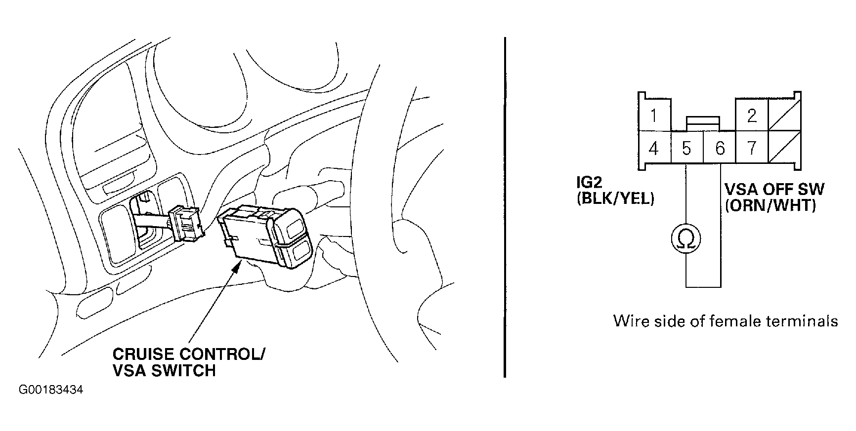 Remove the cruise control/TCS switch from the switch panel. Check for continuity between terminals No. 5 and 6. There should be continuity when the TCS switch is pushed. See Fig 1 .