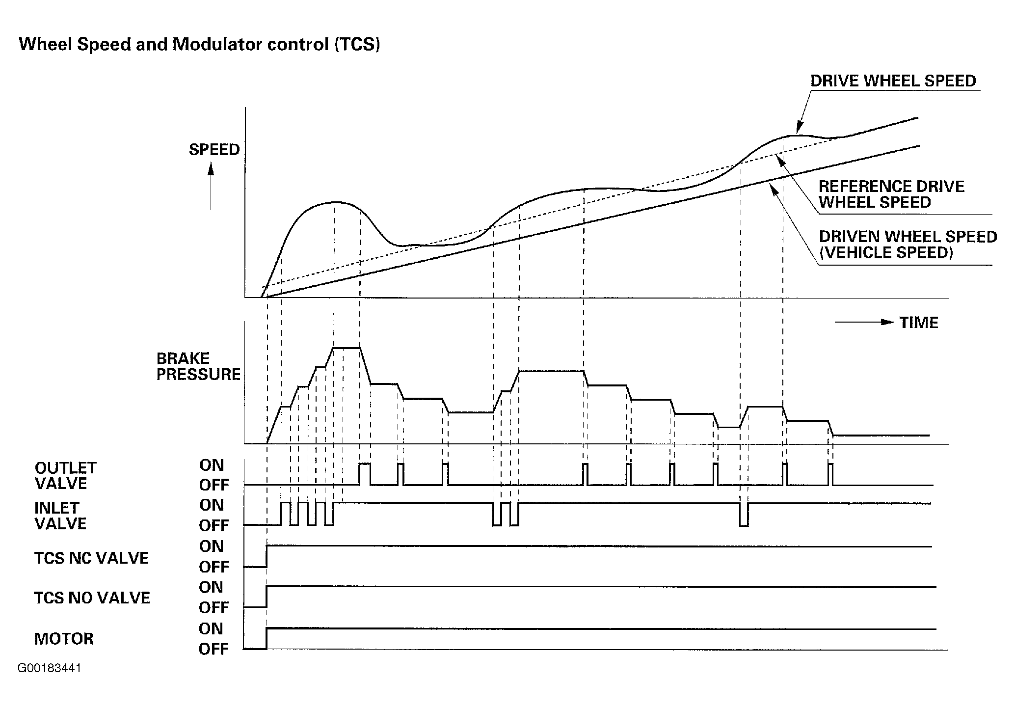 When the front wheel speed rises sharply above the vehicle speed, the TCS Normally Closed (NC) valve opens, the TCS Normally Open (NO) valve closes, and the pump motor starts to intensify the front caliper fluid pressure. When the wheel speed drops, the front inlet valve closes momentarily to retain the front caliper fluid pressure. When the wheel speed drops further, the front outlet valve opens momentarily to reduce the front caliper fluid level pressure. See Fig 2 .