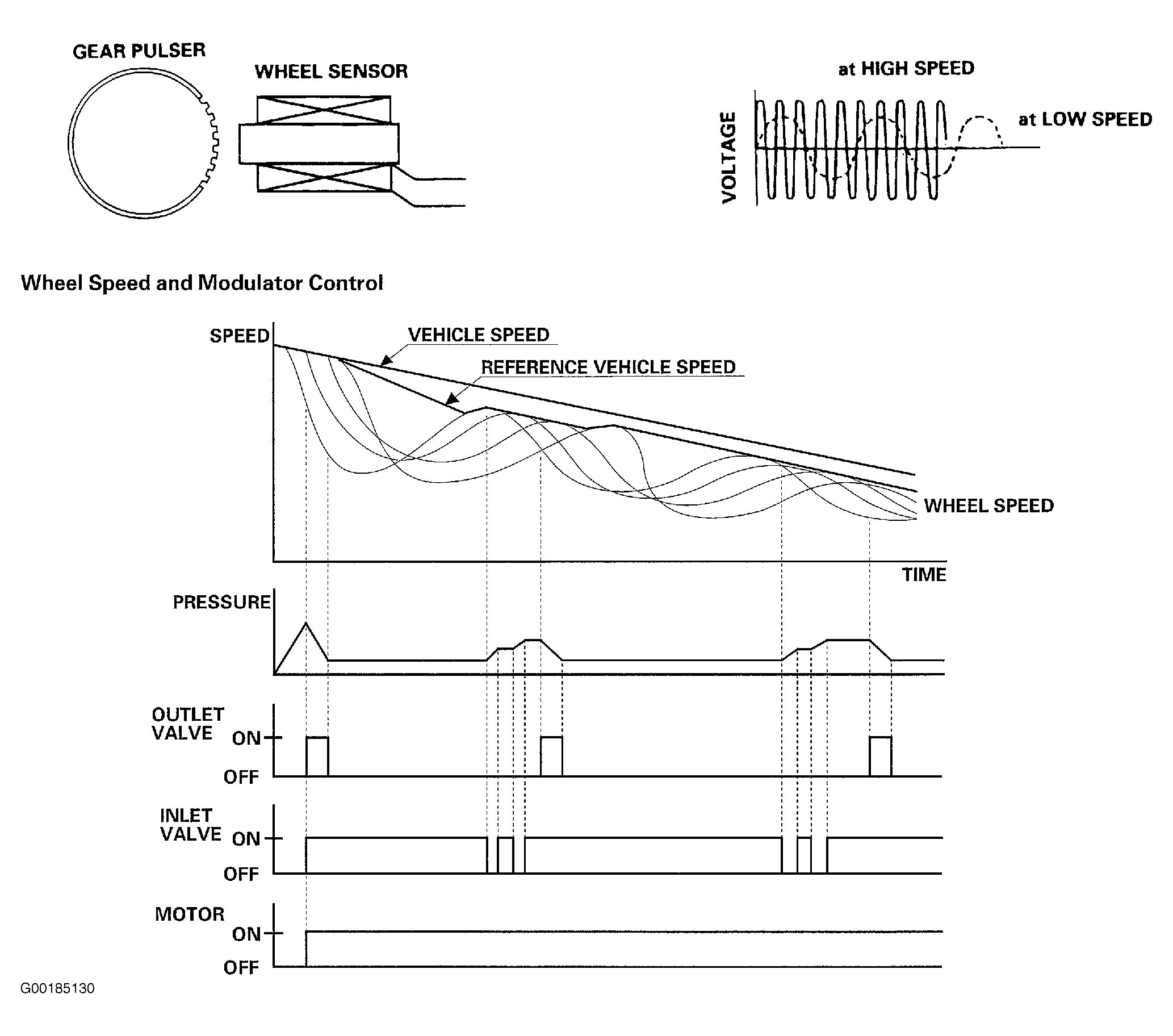 The wheel sensors are the magnetic contactless type. As the gear pulser teeth rotate past the wheel sensor's magnetic coil, AC current is generated. The AC frequency changes in accordance with the wheel speed. The ABS control unit detects the wheel sensor signal frequency and thereby detects the wheel speed. See Fig 1 . When the wheel speed drops sharply below the vehicle speed, the outlet valve opens momentarily to reduce the caliper fluid pressure. The pump motor starts at this time. As the wheel speed is restored, the inlet valve opens momentarily to increase the caliper fluid pressure.