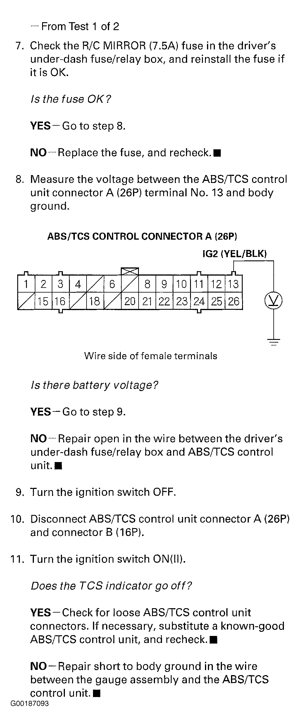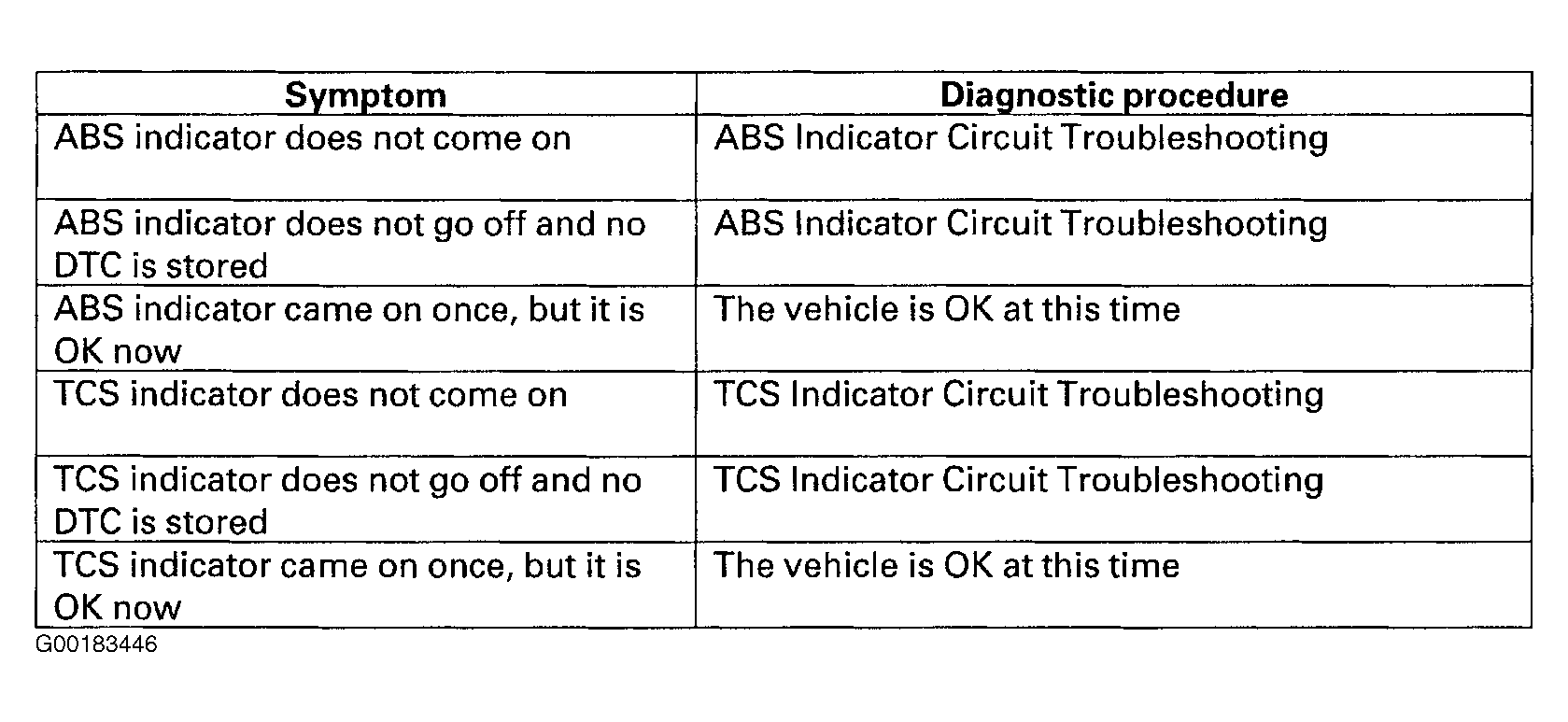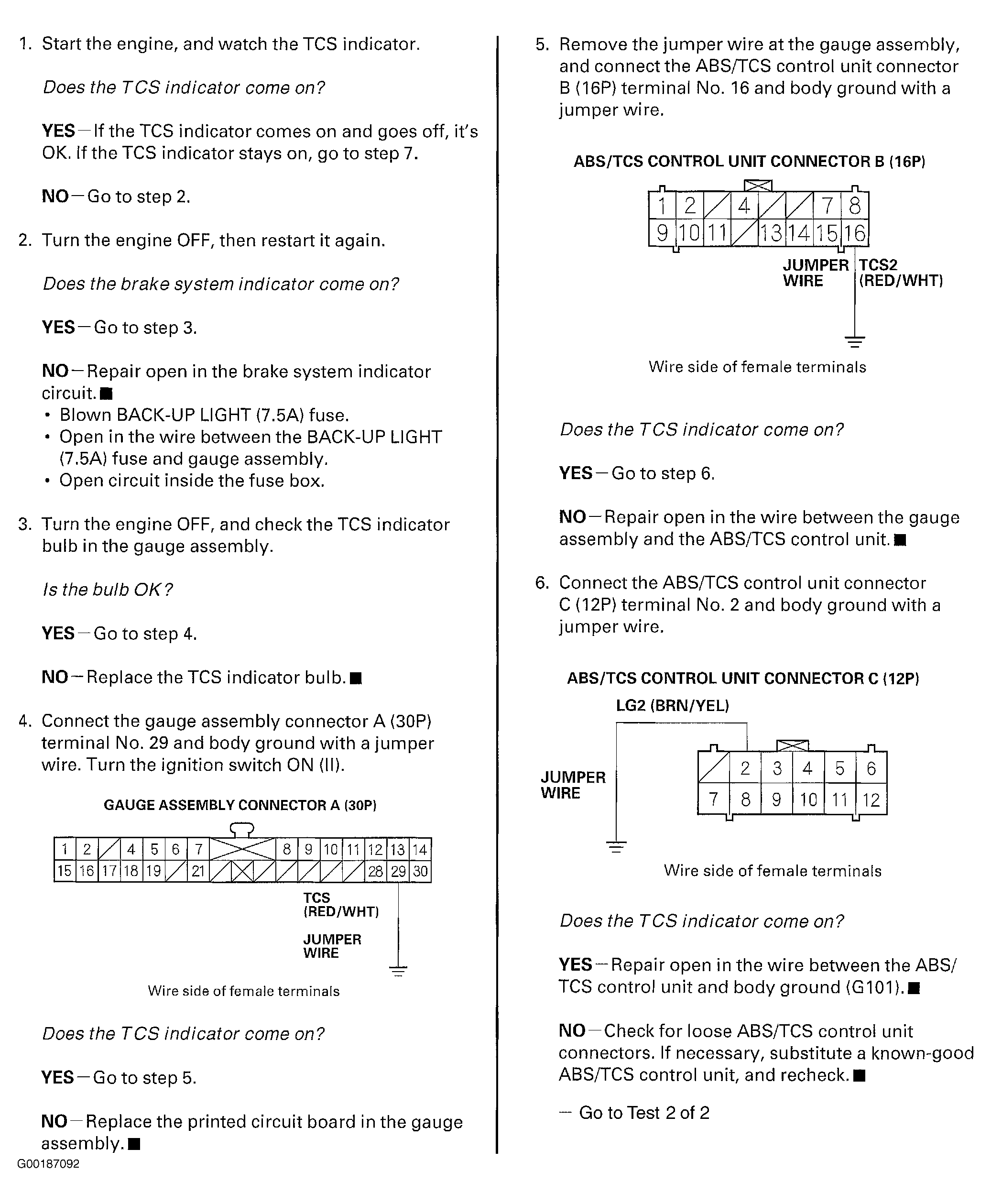 For indicator trouble shooting index, see Fig 1 . If the system is okay, the ABS/TCS indicator goes off once after turning the ignition switch ON without starting the engine, and then come on again and go off several seconds later after starting the engine. This occurs because the ABS/TCS control unit is turned on by the IG2 power source. The ABS/TCS indicator comes on when the TCS control unit detects a problem in the system. The ABS indicator or ABS system indicator will also come on under following conditions, even though the system is operating properly. See ABS INDICATOR  and TCS INDICATOR  .