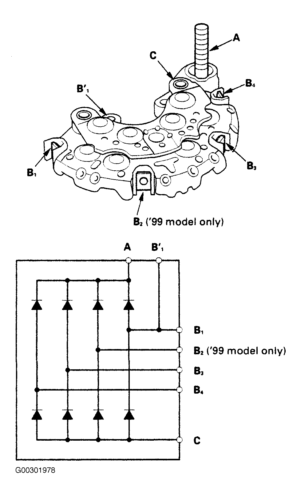 Check for continuity in each direction, between the B terminal "A" and P terminals "B", and between the E terminal "C" and P terminals of each diode pair. See Fig 1. All diodes should have continuity in only one direction. Because the rectifier diodes are designed to allow current to pass in only one direction, and the rectifier is made up of 8 diodes (4 pairs) (6 diodes (3 pairs) for 2000-03 models), you must test each diode in both directions for continuity with an ohmmeter that has diode checking capability: a total of 16 checks (12 checks for 2000-03 models). If any diode is faulty, replace the rectifier assembly (diodes are not available separately). If all the diodes are OK, go to BRUSH  inspection.