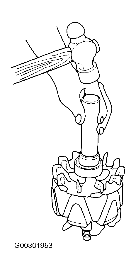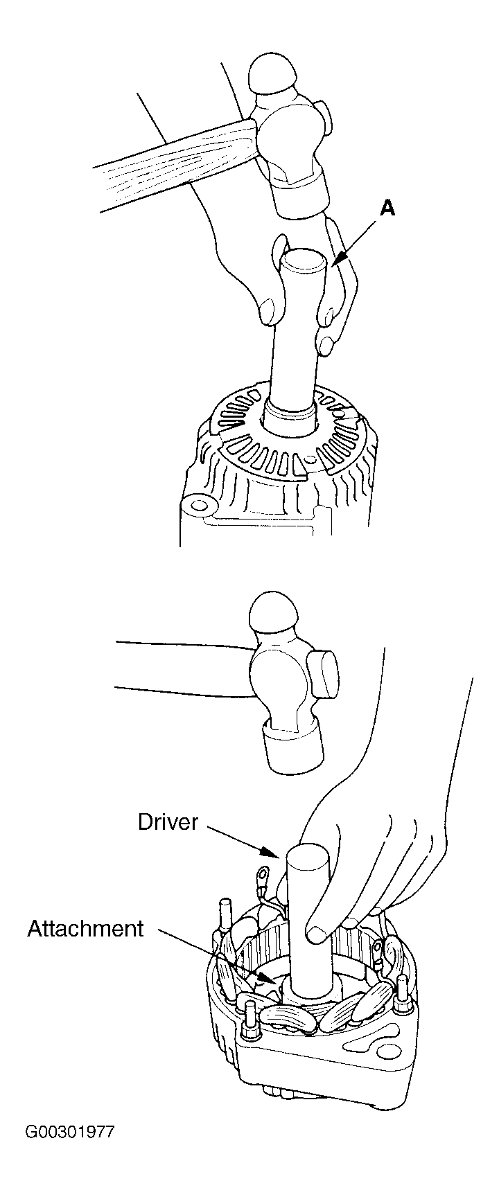 - Support the stator housing in a vise, and drive out the front bearing with a brass drift "A" and hammer.