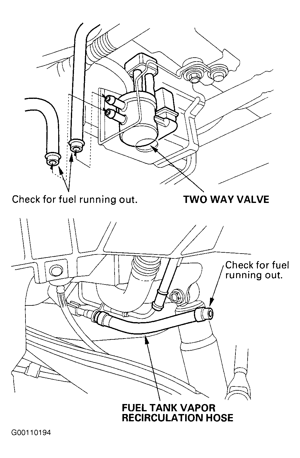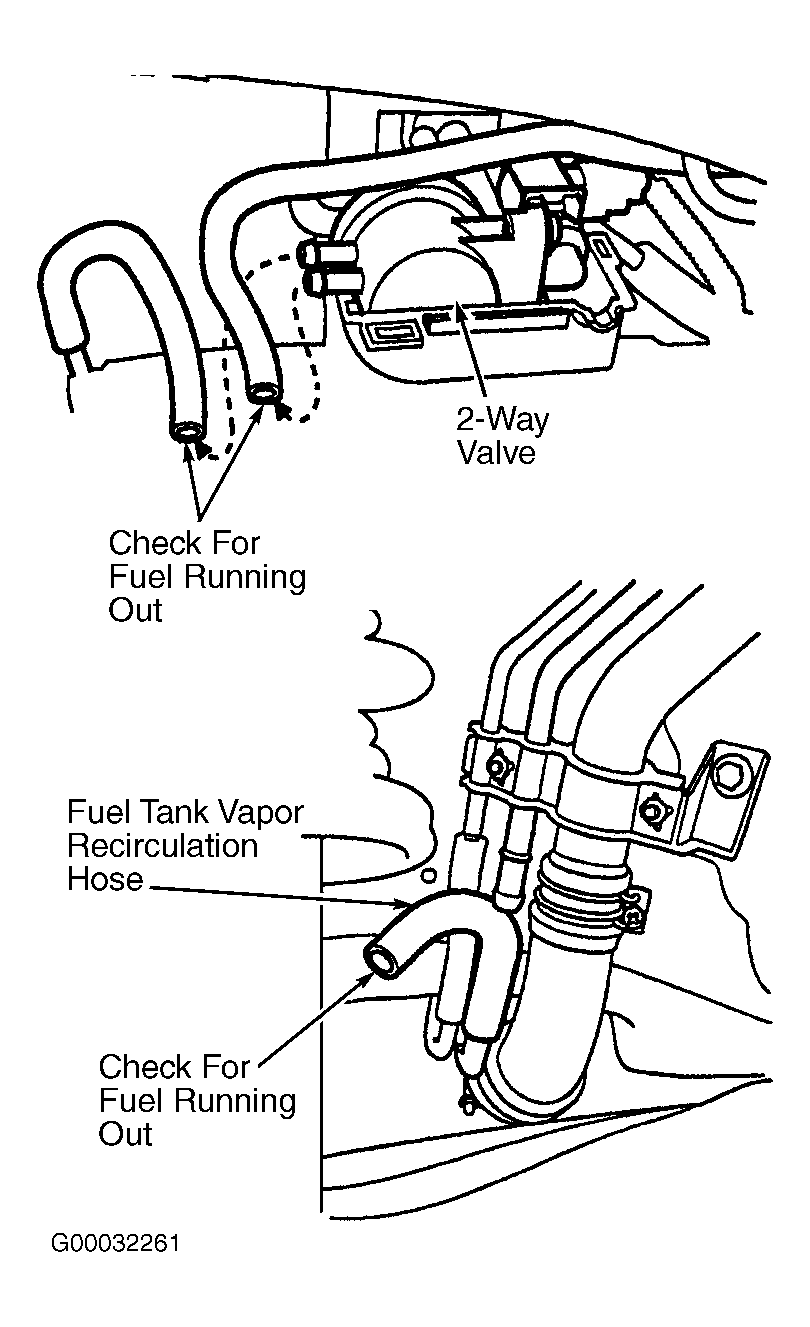 . If fuel runs out of hoses at either location, replace fuel tank vapor control valve. See EMISSION SYSTEMS & SUB-SYSTEMS