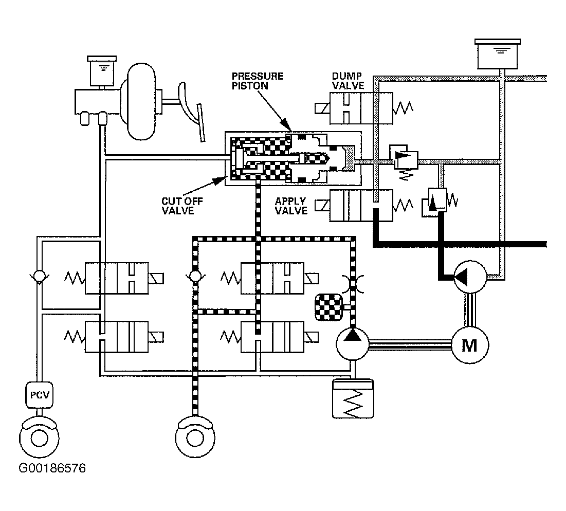 The VSA control unit opens the dump valve and closes the apply valve. The brake fluid for VSA control is reduced from the pressure chamber to the VSA reservoir. The pressure piston returns to standard position, and the cut off valve opens. See Fig 1 .