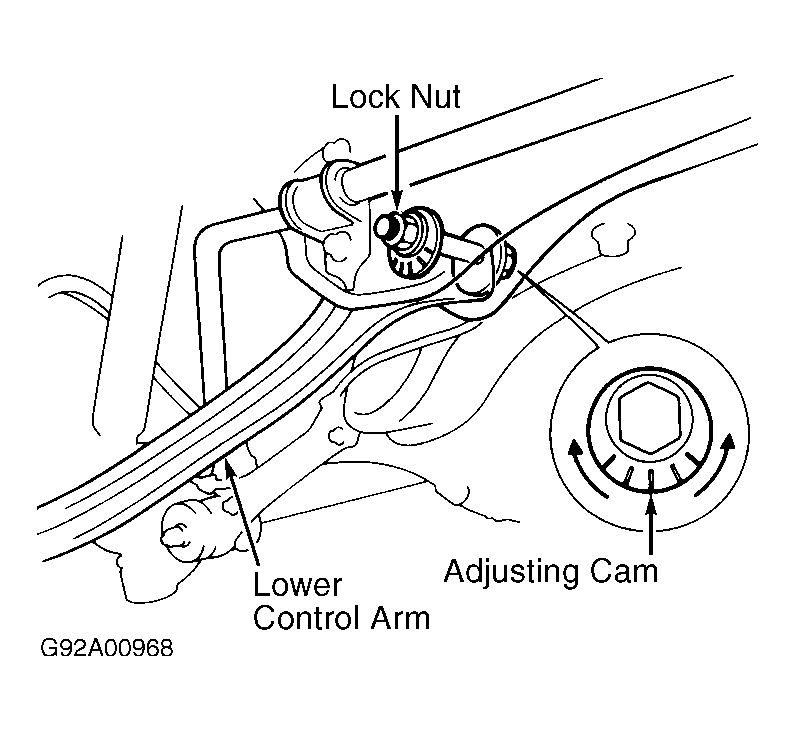 Release parking brake. If parking brake is engaged, toe-in measurement may be incorrect. Hold adjuster bolt on lower control arm, and loosen lock nut. See Fig 1 . Turn adjuster bolt until toe-in is as specified. See WHEEL ALIGNMENT SPECIFICATIONS  . Install NEW lock nut, and tighten to specification. See TORQUE SPECIFICATIONS  .