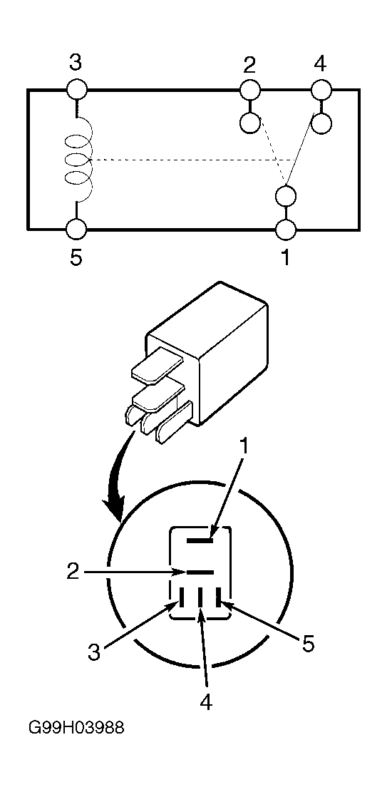 - Check for continuity between the No. 1 and 4 terminals of the shift lock relay while connecting the battery positive terminal to the No. 5 terminal of the shift lock relay and connecting the negative terminal to the No. 3 terminal. See Fig 3. Is there no continuity when connecting the battery terminals, and continuity when disconnecting the battery terminals. If yes, go to next step. If no, replace the shift lock relay.