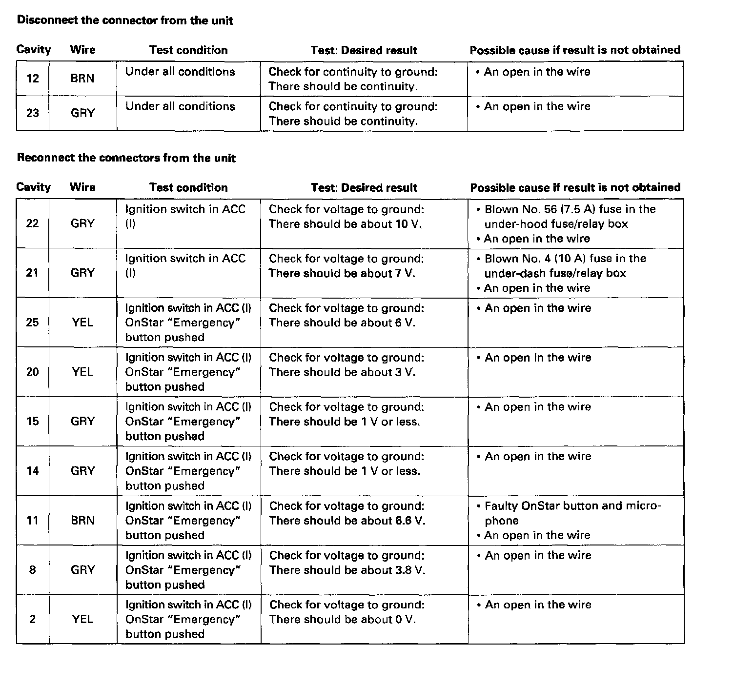 - If the terminals look OK, make the following input tests at the connector.