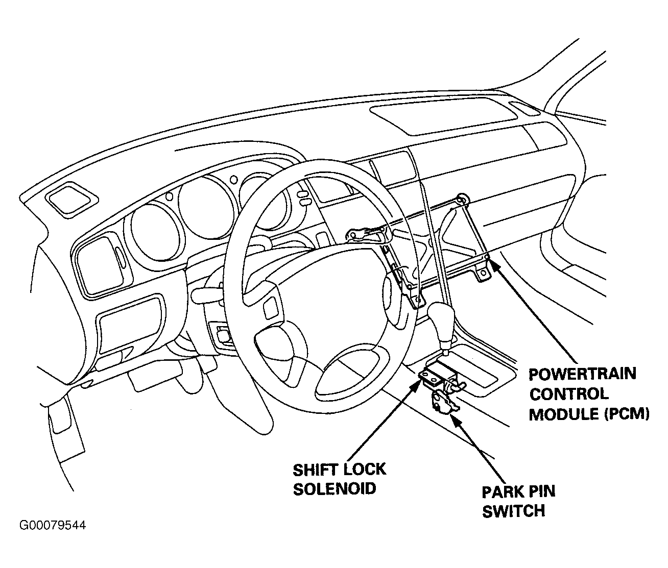 Shift interlock system consists of brake pedal position switch, key interlock solenoid and switch, park pin switch, Powertrain Control Module (PCM) and shift lock solenoid. See Fig 2.
