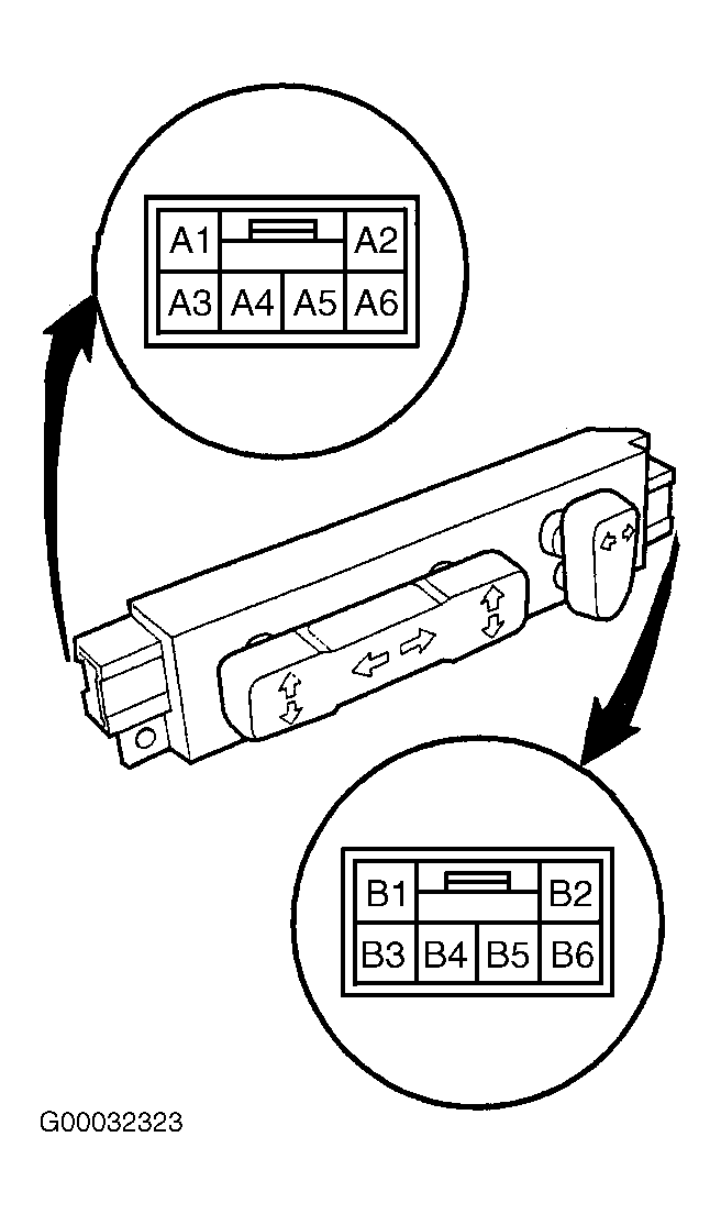 Remove driver's power seat switch. See DRIVER'S POWER SEAT SWITCH  under REMOVAL & INSTALLATION. Disconnect driver's power seat switch connectors. See Fig 1 . Using an ohmmeter, verify continuity exists between terminals as specified. See DRIVER'S POWER SEAT SWITCH CONTINUITY  table. If switch fails any test, replace faulty switch.