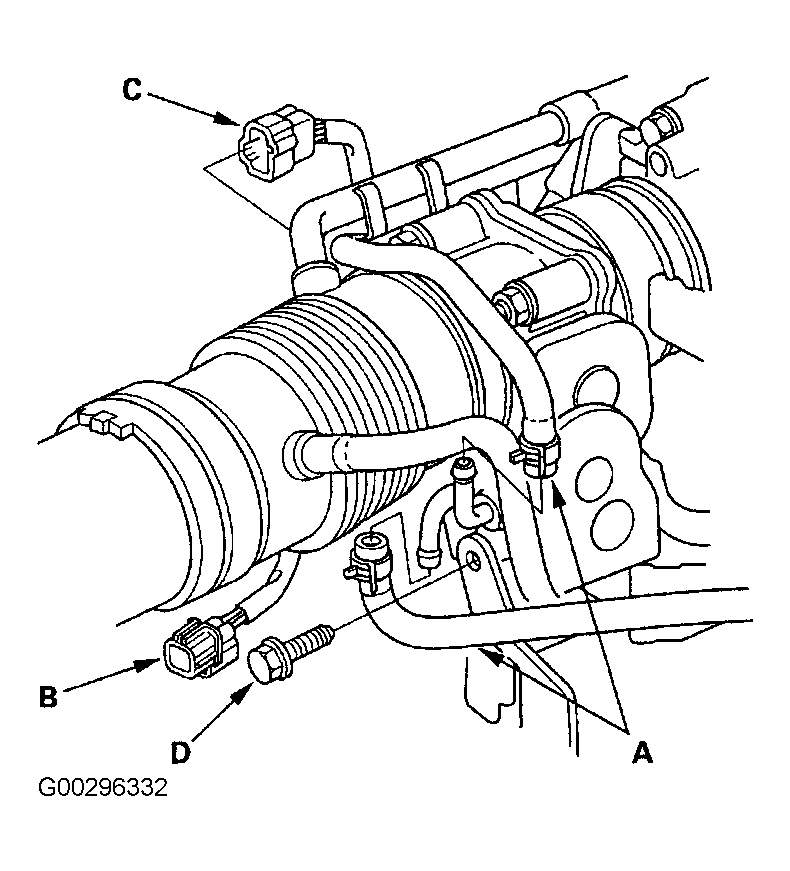 3. Remove the water bypass hoses (A). Disconnect the TCS control actuator connector (B) and TCS control valve angle sensor connector (C) from the TCS control valve assembly, then remove the bolt (D) securing the TCS control valve bracket (J32A2 engine (A/T)). See Figure.