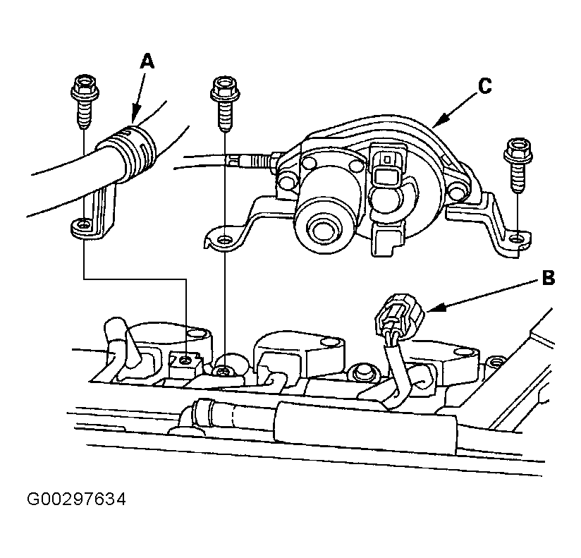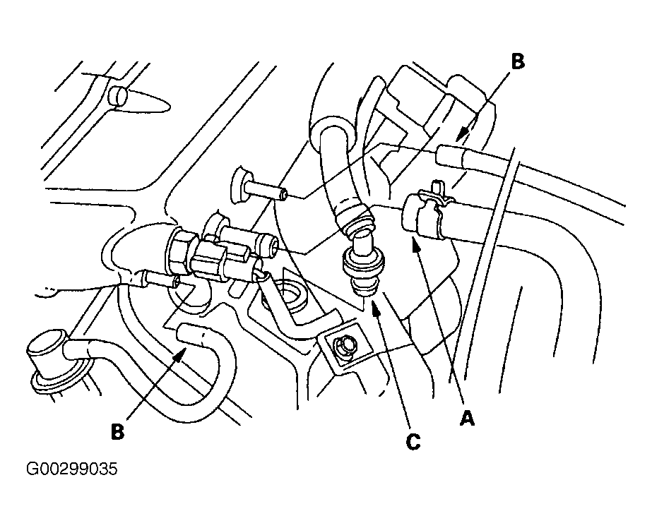 8. Remove the brake booster vacuum hose (A), vacuum hoses (B), and Positive Crankcase Ventilation (PCV) hose (C). See Figure.