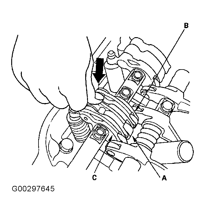 15. Push on the intake mid rocker arm (A) for the No. 1 cylinder. See Fig 1. The mid rocker arm should move independently of the primary rocker arm (B) and secondary rocker arm (C).
