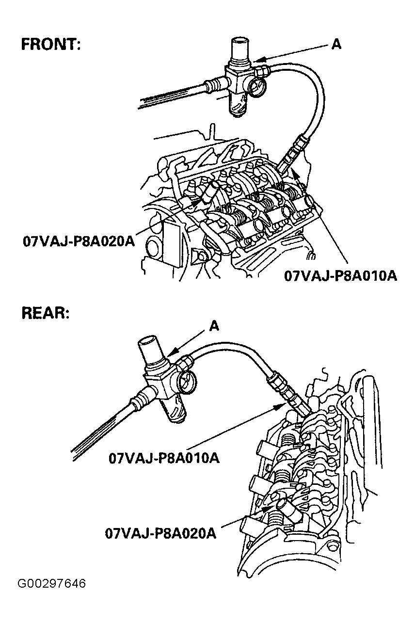 20. Remove the 2 end intake rocker shaft mounting bolts, then install and connect the air regulator, VTEC air adapter, VTEC air stopper, and an air pressure regulator with a 0-100 psi gauge (A). See Fig 2.
