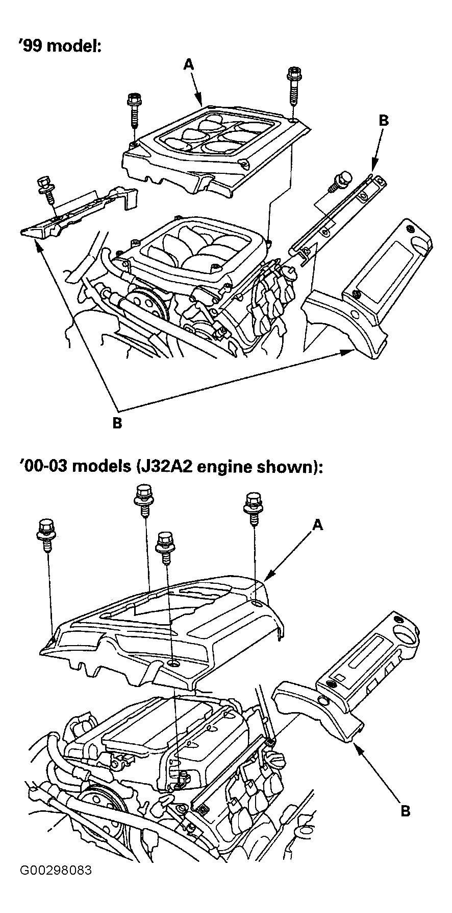 2. Remove the intake manifold cover (A) and ignition coil cover (B). See Figure.