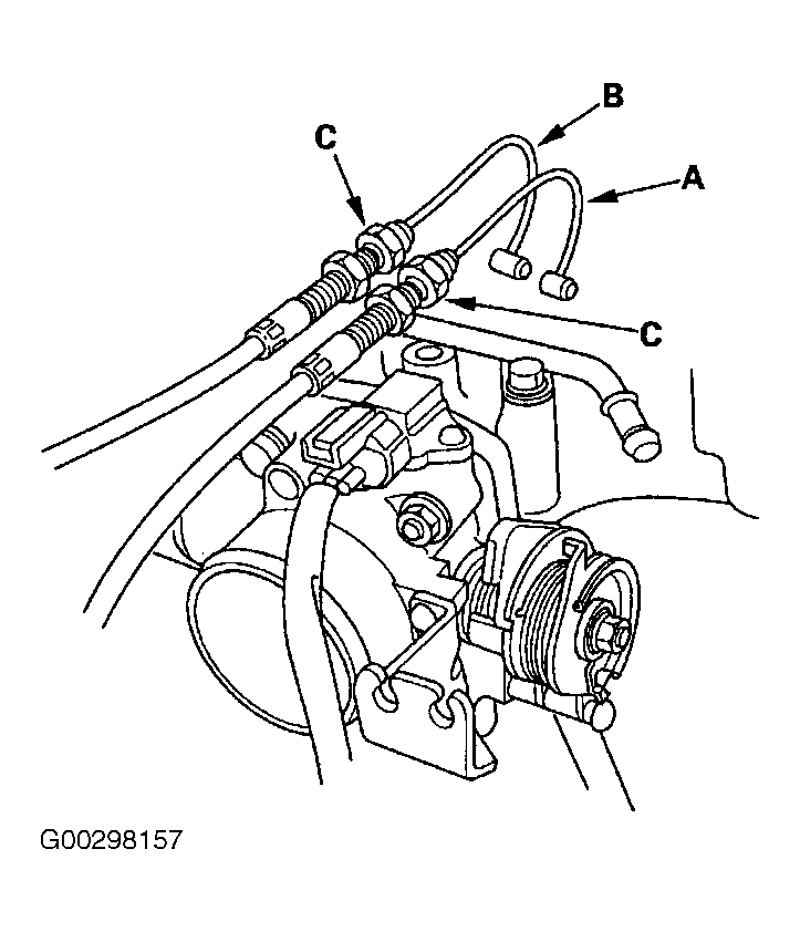 6. Remove the throttle cable (A) and cruise control cable (B) by loosening the locknuts (C), then slipping the cable ends out of the accelerator linkage. See Figure. Take care not to bend the cables when removing them. Always replace any kinked cable with a new one.
