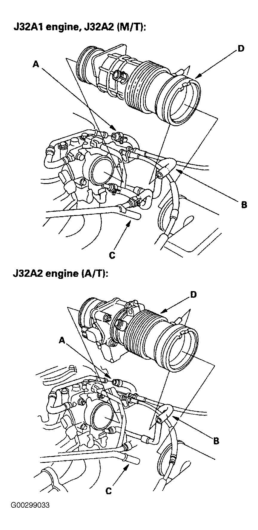 5. Remove the vacuum hose (B) and breather pipe (C), then remove the intake air duct (D).