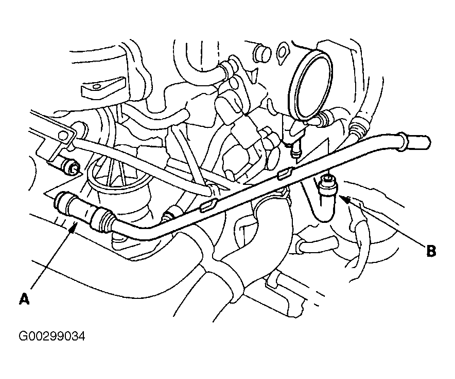 7. Remove the breather hose (A) and water bypass hose (B). See Figure.